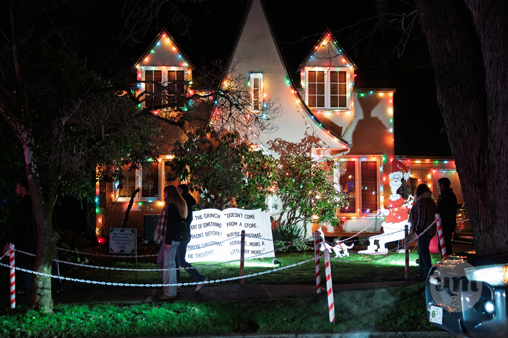 A whimsical night scene on Peacock Lane in Southeast Portland featuring a large, illuminated cutout of The Grinch and his dog Max. The display includes a giant open book prop with the famous Dr. Seuss quote about the true meaning of Christmas. Set against a classic storybook-style house adorned with multi-colored lights, the image captures pedestrians enjoying one of the most popular and nostalgic yard displays in this historic National Historic District.