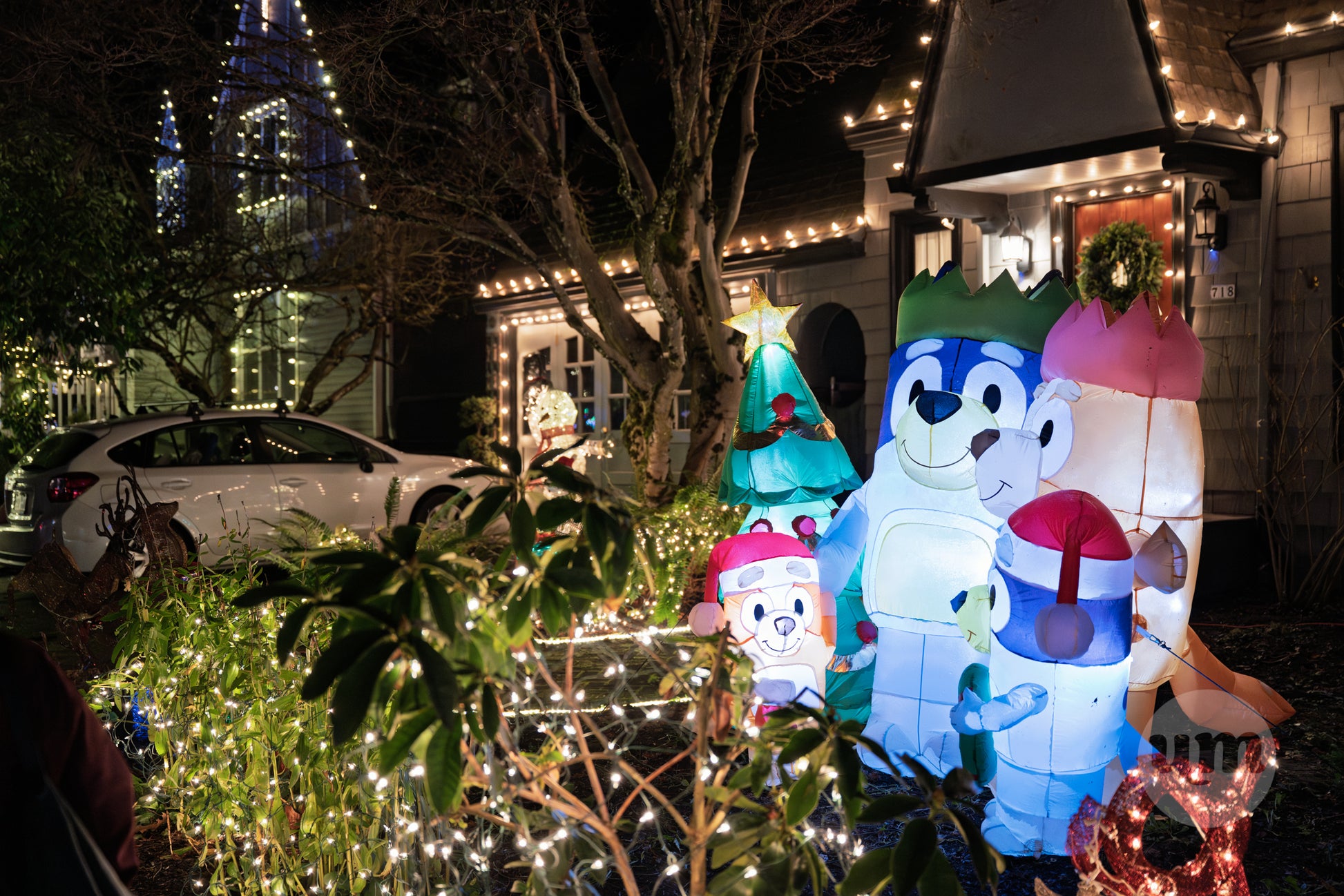 A charming night photograph of a front yard on Peacock Lane in Southeast Portland featuring large, illuminated Bluey Christmas inflatables. The display includes the entire Heeler family—Bluey, Bingo, Bandit, and Chilli—wearing festive hats next to a glowing inflatable Christmas tree. Set against the backdrop of a historic Tudor Revival home with twinkling string lights, this image captures the modern, family-friendly decorations that make this National Historic District a beloved holiday destination.