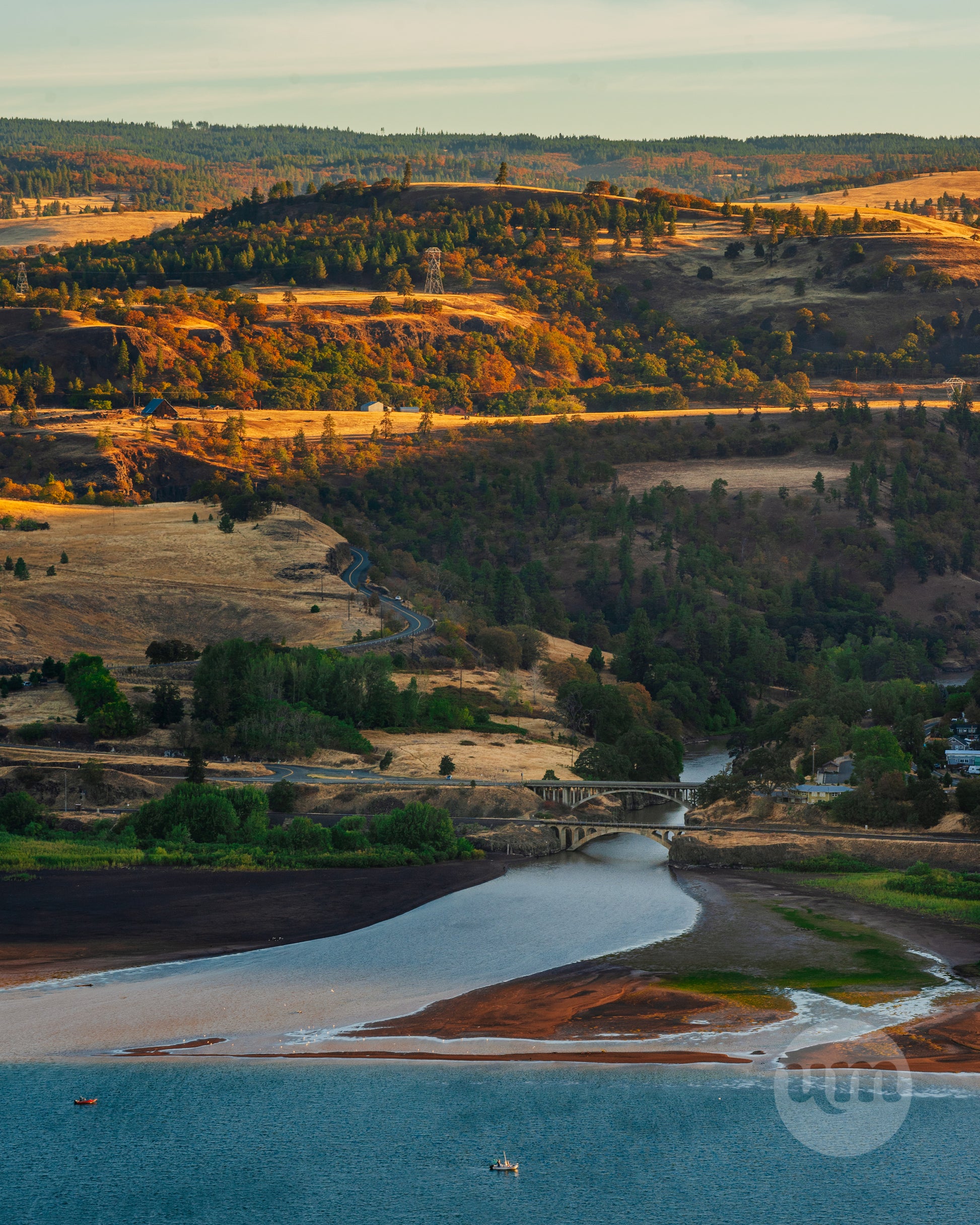 A stunning photograph of the Klickitat Canyon and its surrounding landscape in the Columbia River Gorge during golden hour. The rolling hills are bathed in warm evening sunlight, with a small town and bridges nestled in the valley. The tranquil river in the foreground, with a few small boats, adds to the peaceful, serene, and rustic beauty of the scene.