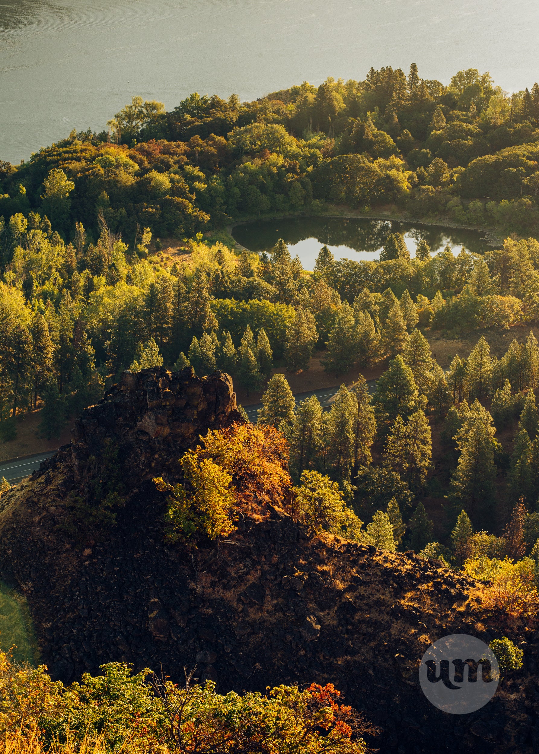 A stunning high-angle photograph of the Columbia River Gorge, looking down over a small, serene lake. The image captures the lush, green forest illuminated by the warm, golden light of evening. The dark rock formations in the foreground contrast with the bright, sunlit trees and the peaceful, reflective water of the lake, creating a beautiful and majestic natural scene.