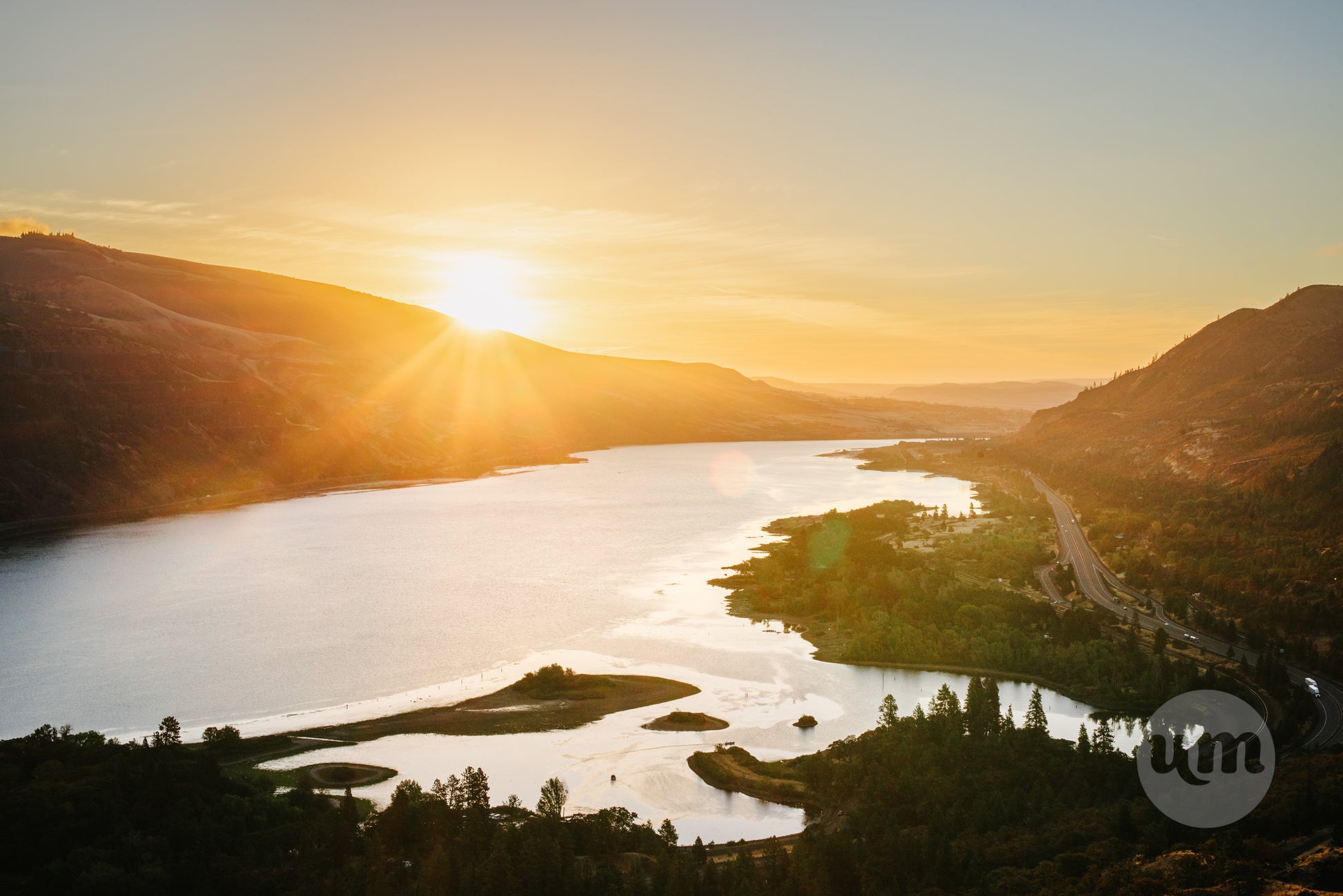 A stunning, sweeping photograph of the Columbia River Gorge during golden hour. The setting or rising sun creates a brilliant sunburst over the rolling hills, casting a warm, golden glow across the calm water of the Columbia River. The image captures a sense of peaceful grandeur and the serene beauty of the vast, natural landscape.