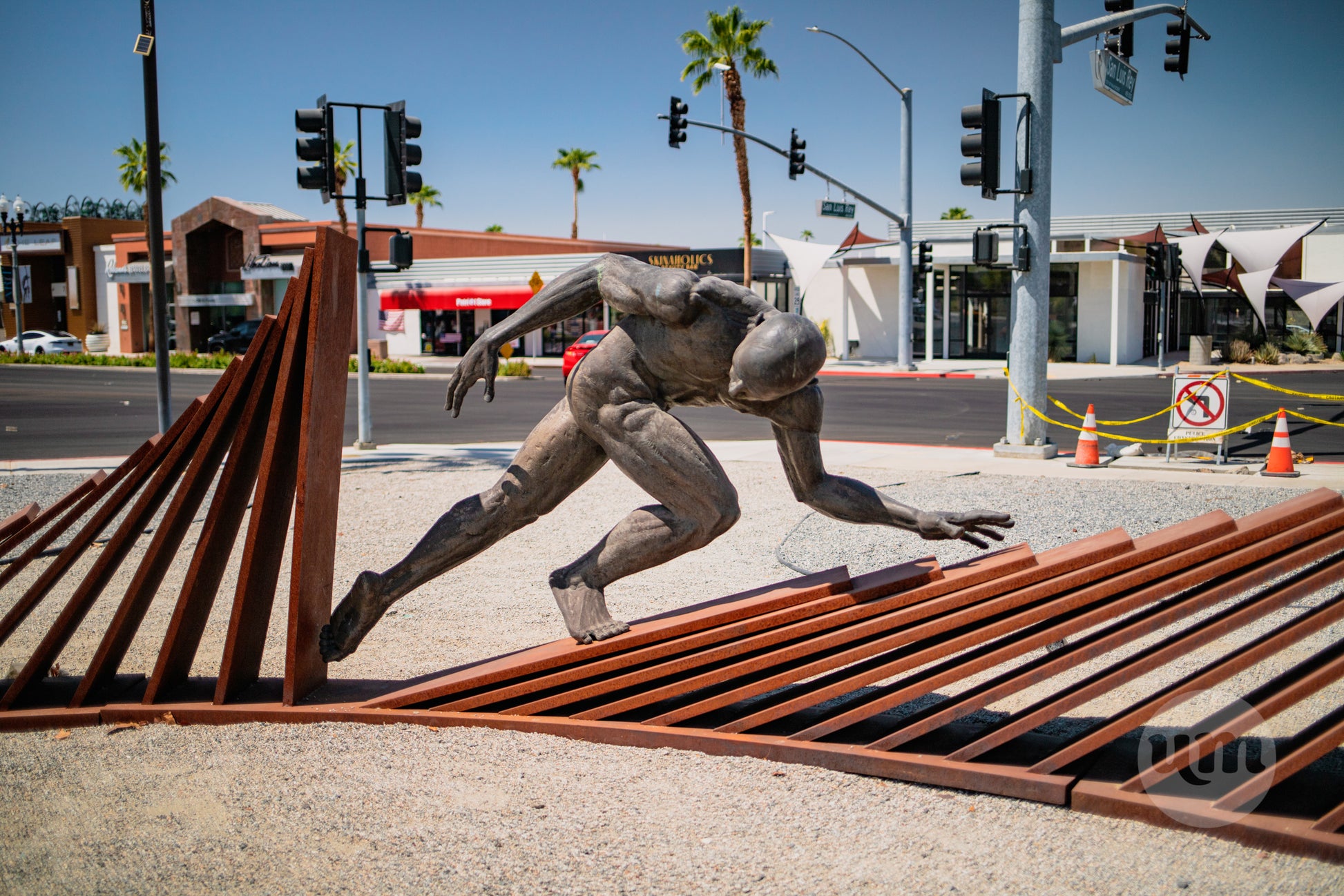A dramatic sculpture of a male figure running is featured in the Melissa Morgan Sculpture Garden in Palm Desert, California. The sculpture is a dynamic piece of public art set on a gravel and grassy urban median. Buildings, traffic lights, and palm trees are visible in the background, capturing a striking blend of human form and urban landscape.