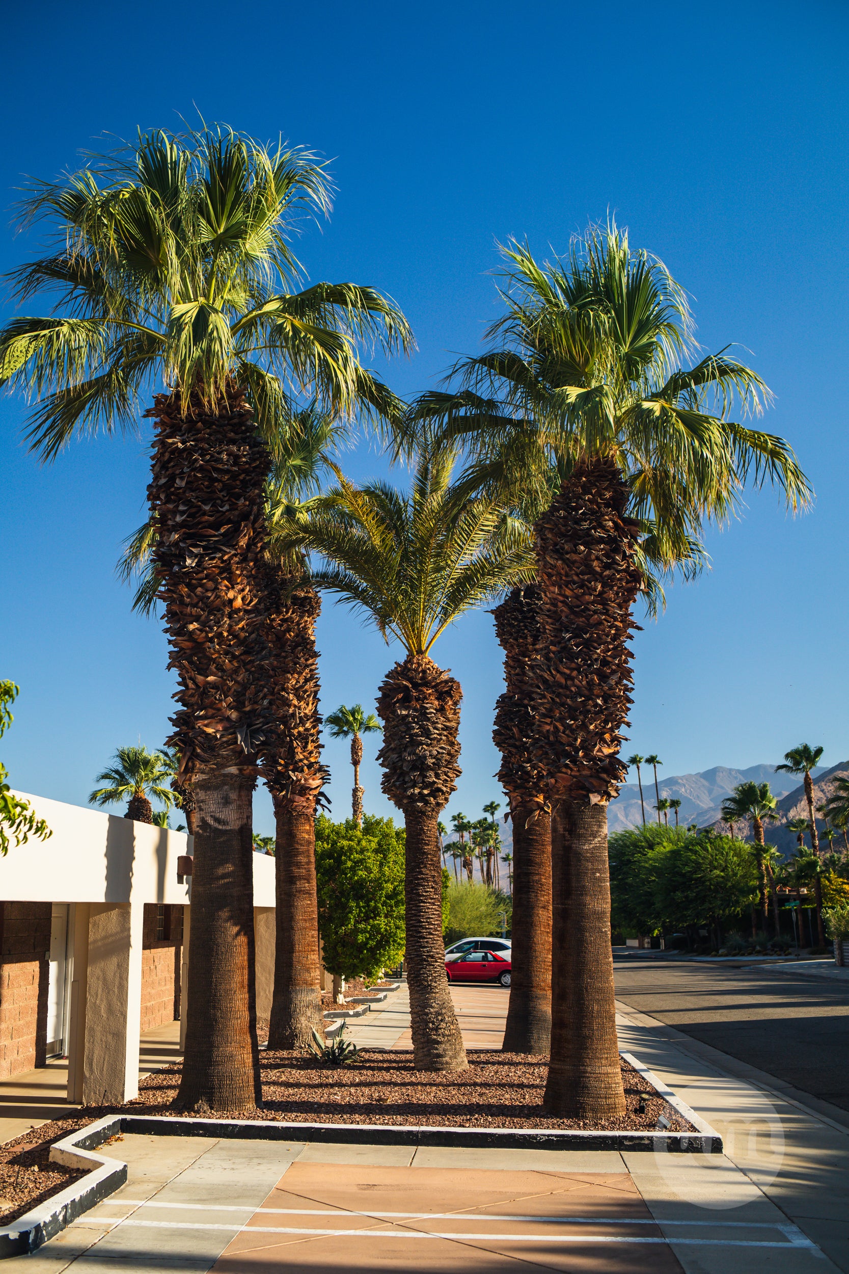 A cluster of tall, majestic palm trees with shaggy trunks stands on a sidewalk in Palm Springs, California. The trees are set against a clear blue sky, with the mountains visible in the distance. The image highlights the iconic flora and serene landscape of the desert city.