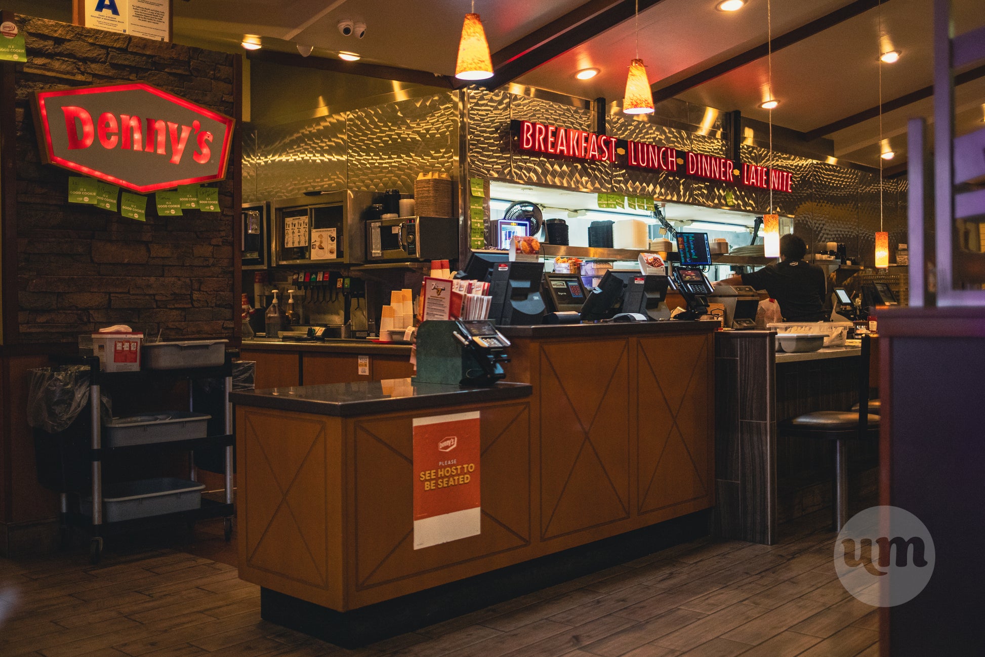 The interior of a classic Denny's diner in Palm Springs, California, is captured with its retro-style counter and glowing red sign. The warm lighting and welcoming atmosphere evoke a sense of nostalgia and comfort, highlighting a casual dining experience that is a staple of American culture.