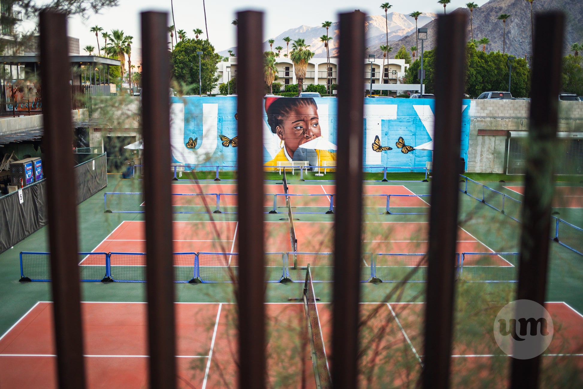 A striking mural titled "Unity" by Mister Alek is visible behind a series of empty red tennis courts in Palm Springs, California. The mural depicts a woman's portrait with butterflies, framed by a wooden fence in the foreground. The scene captures the city's blend of public art and recreational spaces against a backdrop of mountains and palm trees.