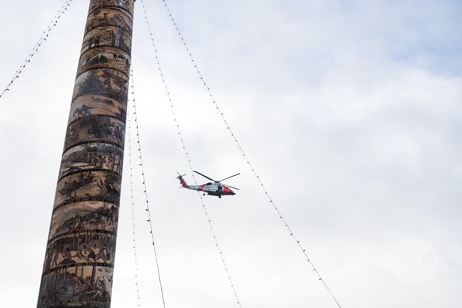 A dynamic photograph capturing a US Coast Guard helicopter flying past the historic Astoria Column on a cloudy day. The helicopter is clearly visible in the open sky, contrasted against the massive, historically engraved column in the foreground. The image connects the city's maritime history (represented by the Bar Pilots' work on the Columbia River Bar) with modern aviation and safety efforts. This photograph is ideal for licensing in projects focused on Astoria landmarks, Coast Guard activities, Pacific Northwest history, and the meeting of land, sea, and air.