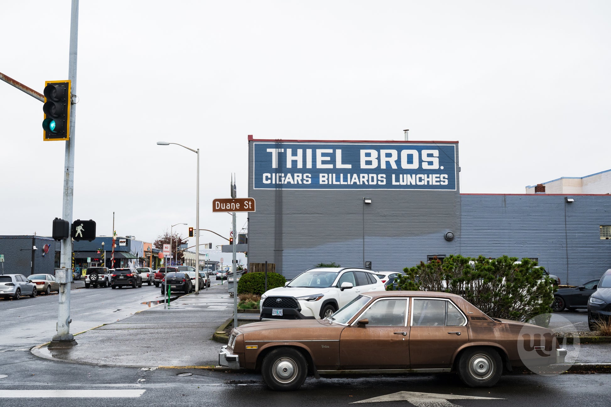 A street-level photograph capturing a busy urban intersection on Duane Street in downtown Astoria, Oregon. The foreground features a classic brown vintage sedan parked by the curb, with a modern white SUV behind it. Dominating the background is a large, retro sign for "THIEL BROS. CIGARS BILLIARDS LUNCHES" painted on the side of a two-toned gray and blue commercial building. The scene includes a traffic light with a green signal and a wet asphalt road under a bright, overcast sky, showcasing the blend of historic businesses and everyday traffic in the city center.