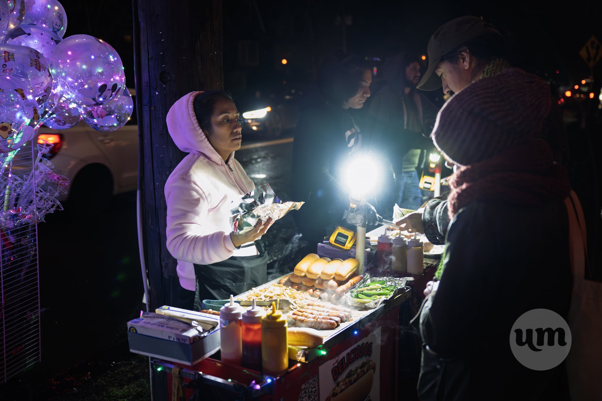 A candid night photograph of a street food vendor serving customers at the entrance to Peacock Lane in Southeast Portland. The image features a woman in a pink hoodie preparing grilled hot dogs and sausages on a mobile cart, illuminated by a bright work light. In the background, glowing character balloons and the movement of holiday crowds capture the bustling, community-driven atmosphere of this iconic Portland Christmas tradition.