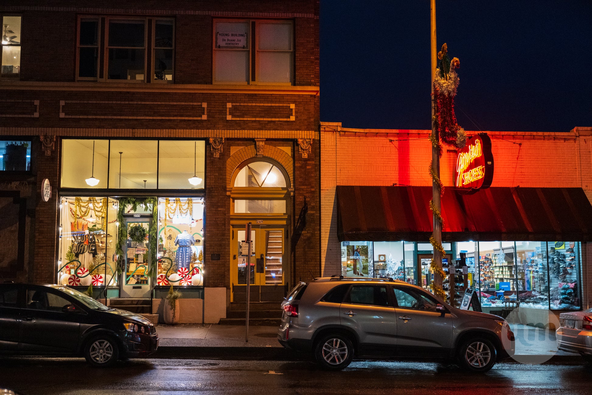 A vibrant photograph of a historic downtown Astoria, Oregon street scene at night. The image captures two brightly lit storefronts, with the brick building on the left decorated with festive Christmas or holiday garlands and lights. The building on the right features a prominent vintage neon sign glowing red and yellow. Parked cars sit on the wet street, reflecting the urban lights, conveying a moody and atmospheric sense of small-town commerce and holiday spirit on a rainy night in the Pacific Northwest.