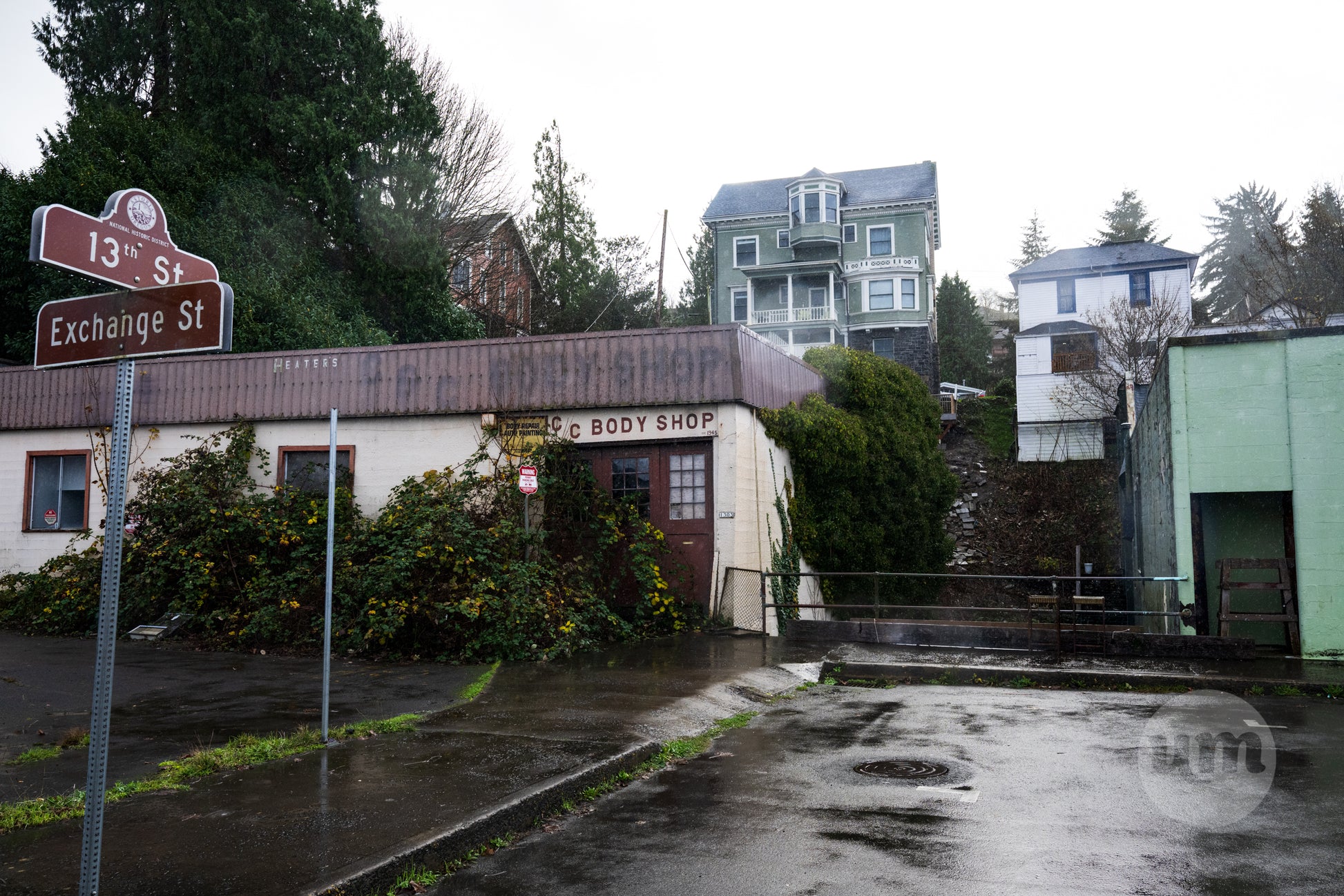 A candid and evocative photograph capturing the raw character of Astoria, Oregon, at the corner of 13th St and Exchange St. The scene is dominated by a weathered, single-story body shop with its facade partially overgrown by vegetation, suggesting an atmosphere of urban decay or closure. In stark contrast, a stately, historic Victorian home with a large bay window sits high on the steep, wooded hill behind the shop. The wet asphalt and overcast sky emphasize the moody, authentic atmosphere of this coastal town.
