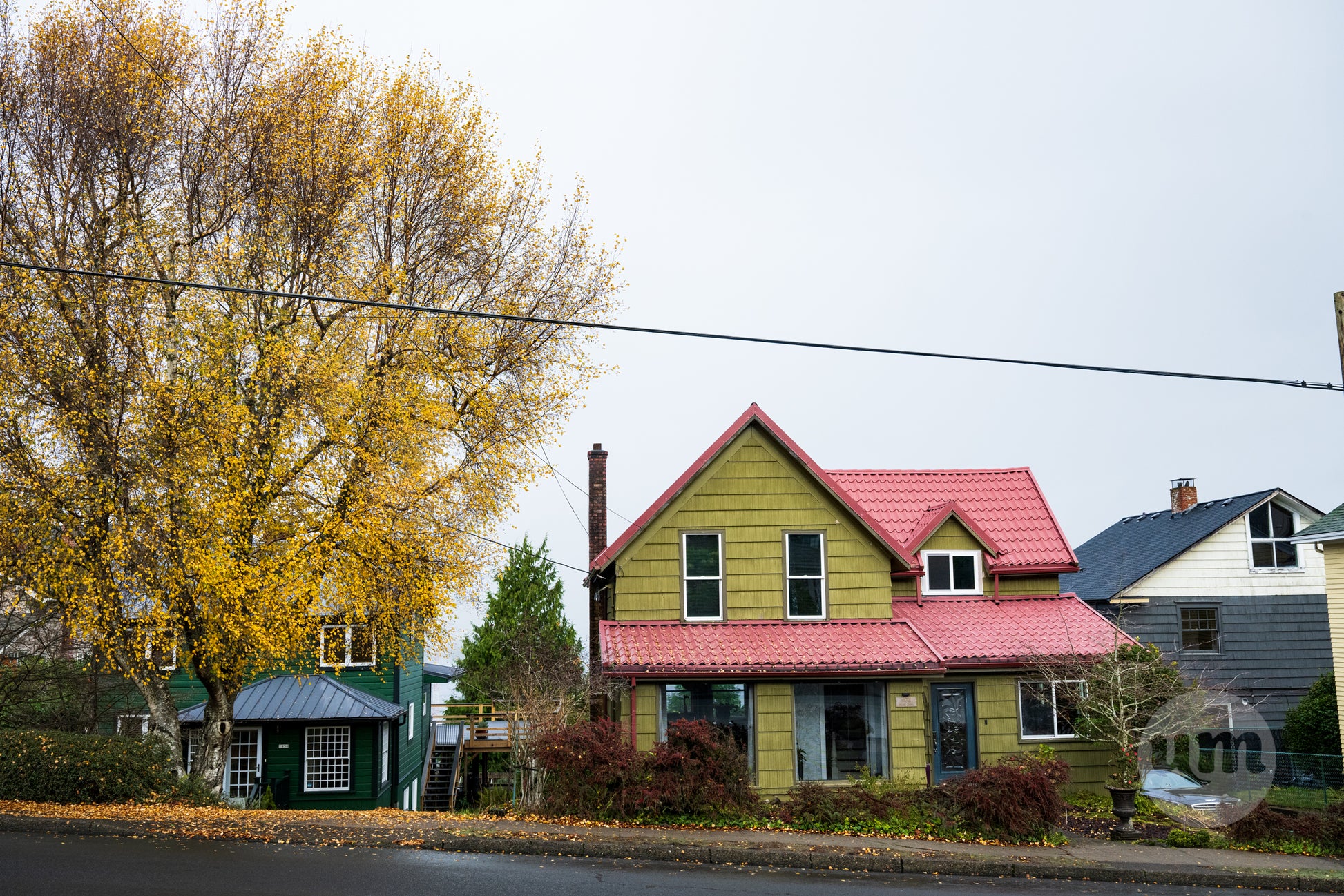 A vibrant, street-level photograph capturing a distinctive, colorful home in a historic Astoria, Oregon neighborhood. The house features olive-green siding and a bold, bright red standing-seam metal roof, with a prominent front porch. To the left, a large deciduous tree is covered in striking yellow and orange autumn foliage. Another small green house and a dark-sided home are visible in the background, all set against a white, overcast sky, showcasing the unique and colorful architectural character of the Pacific Northwest city.