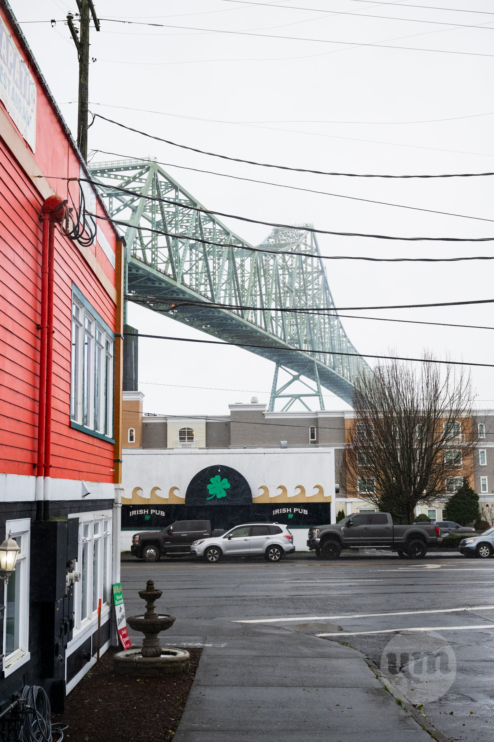 A striking, low-angle photograph capturing the vibrant red exterior of a building and a nearby Irish Pub sign in downtown Astoria, Oregon. The view is dominated by the massive green steel truss structure of the Astoria-Megler Bridge towering immediately overhead, framing the scene. The pub sign, featuring a large green shamrock, is located above parked vehicles on the wet street. The image vividly illustrates the way Astoria's urban businesses are situated beneath the monumental scale of its surrounding industrial and transportation infrastructure.