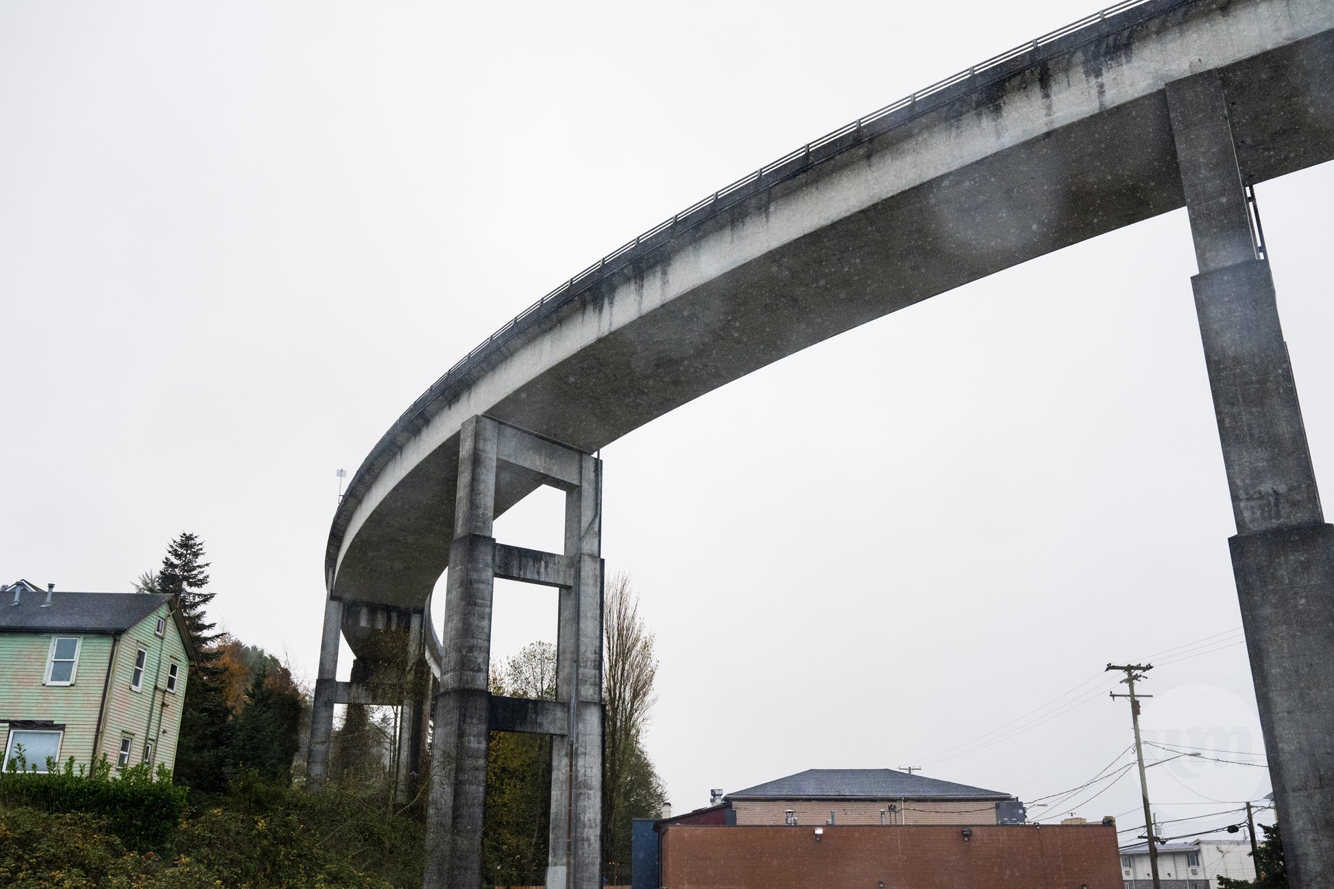 A striking, low-angle photograph of a massive, curving concrete viaduct or bridge overpass dominating the foreground and middle ground of the scene. The elevated structure is supported by heavy, geometric concrete pillars that frame a view of the hillside below. A light green residential house and a low-slung, red-brick commercial building are visible beneath the structure, illustrating the dramatic contrast between the massive scale of modern engineering and the surrounding urban landscape of Astoria, Oregon.