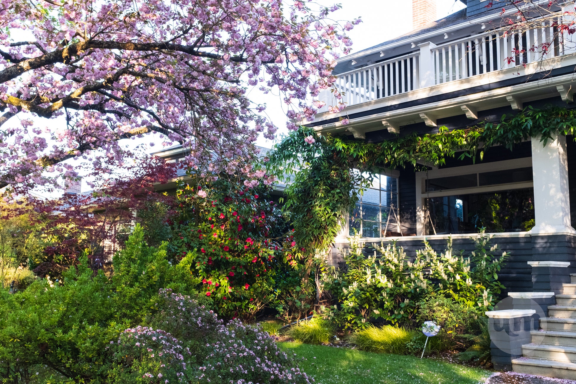 A classic Portland, Oregon home is surrounded by a lush and vibrant garden in full bloom. A beautiful pink cherry tree is in the foreground, with various flowering shrubs and climbing vines framing the dark-colored house. The scene captures the city's celebrated garden culture and historic residential charm.
