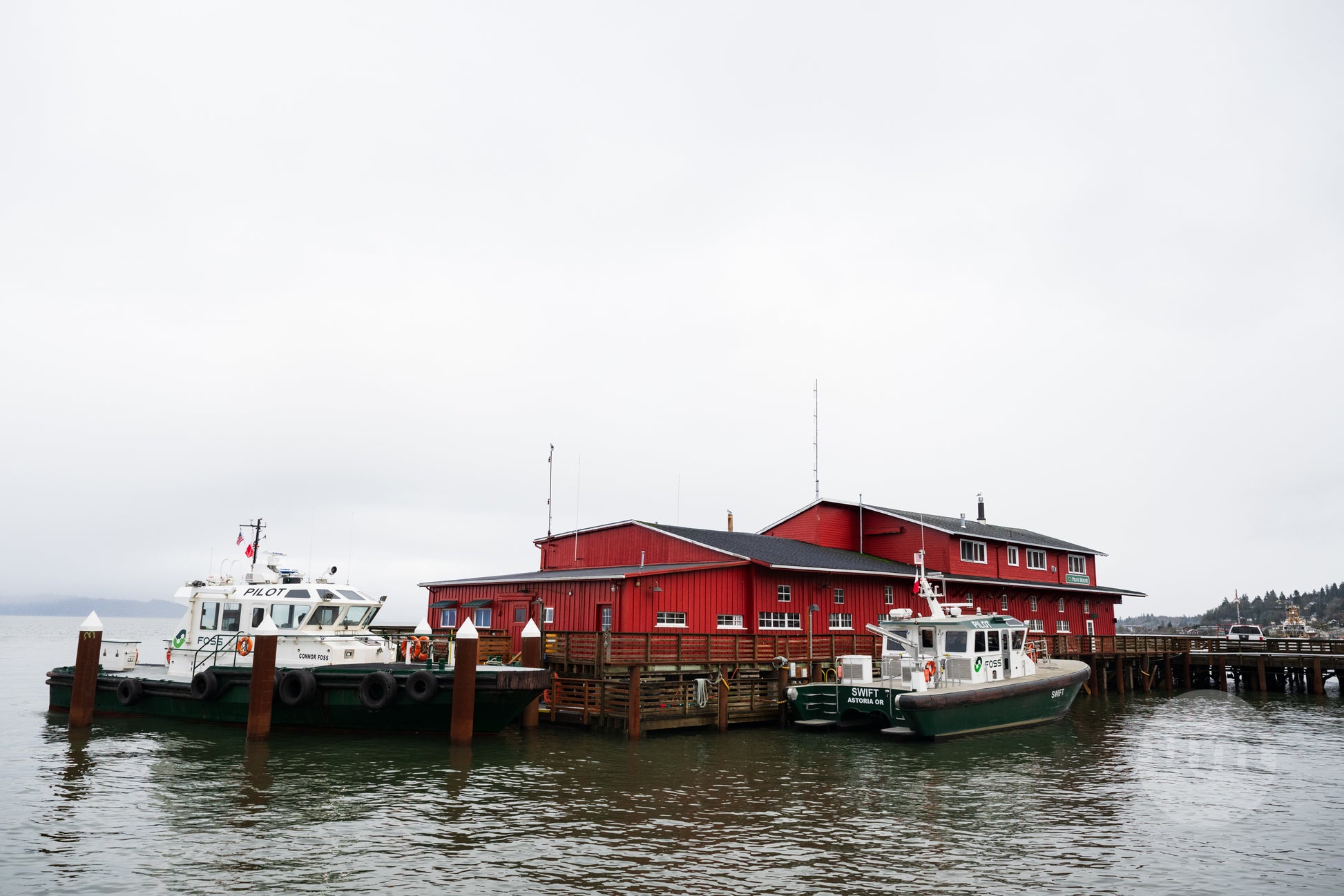 A wide-angle photograph capturing the maritime operations on the Columbia River in Astoria, Oregon. The foreground features a prominent, two-story red building constructed on a pier, connected to the land by a long, wooden walkway. Two distinct pilot boats—white and dark green—are moored to the wooden dock in front of the building. The scene is set under a bright, fully overcast sky, emphasizing the vital role of the Columbia River Pilot service in this coastal shipping town.