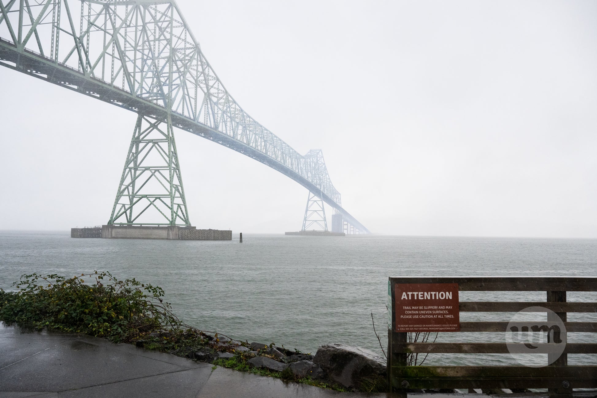 A street-level photograph capturing a two-story white commercial building on a corner in Astoria, Oregon, featuring a storefront for "SoonYi Sushi" and a large mural of a sailboat painted on the lower facade. The building sits at the base of a steep hill, contrasting with the colorful blue residential houses visible on the slope behind it. Power lines and a traffic light frame the top of the scene, which is set against a bright, overcast sky, illustrating the mix of commerce and housing in this hilly coastal town.