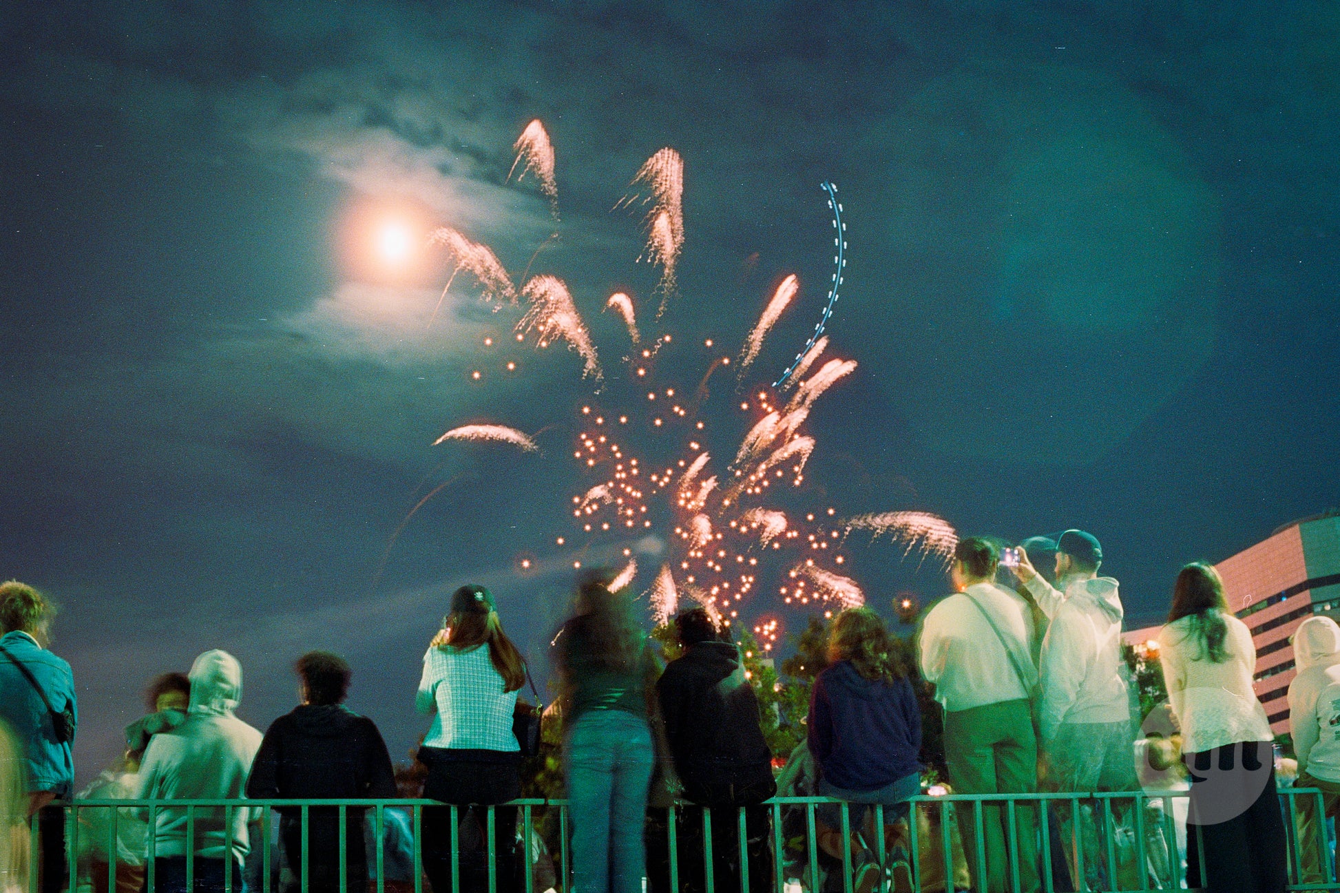 A breathtaking photograph captures a firework explosion illuminating the night sky over downtown Portland, Oregon. A crowd of people watches from behind a bridge railing, their silhouettes framed by the vibrant light of the fireworks and the glowing full moon. The image beautifully captures a shared and serene moment of urban celebration.