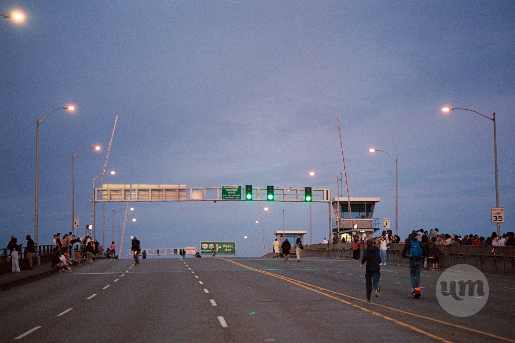 A candid street photograph captures a lively evening scene on the Morrison Bridge in Portland, Oregon. The normally busy street is closed to cars, allowing a crowd of people to walk and ride electric scooters. A person runs towards the camera, with a crowd of people on either side of the bridge, highlighting a sense of peaceful urban celebration.