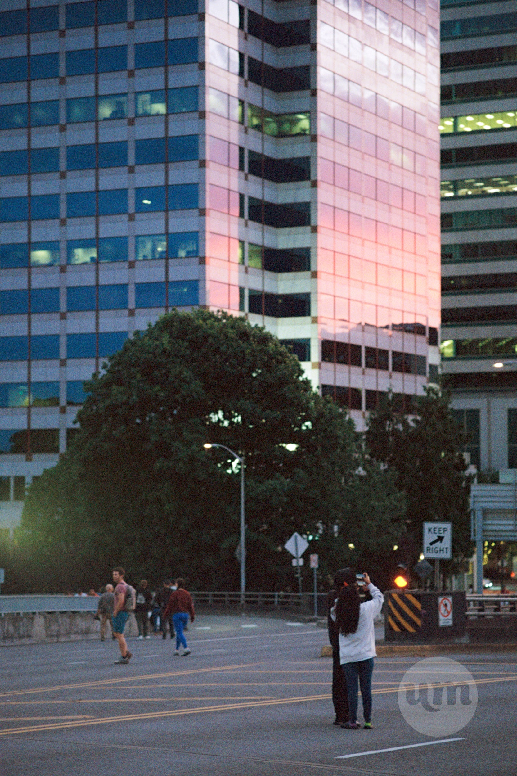 A candid street photograph captures a couple taking a picture of the glowing city buildings at dusk in downtown Portland, Oregon. The modern building in the background reflects the soft, warm light of the evening sky, creating a beautiful contrast with the deep blue shadows. The image captures a quiet, "slice of life" moment, showing people appreciating the urban landscape.