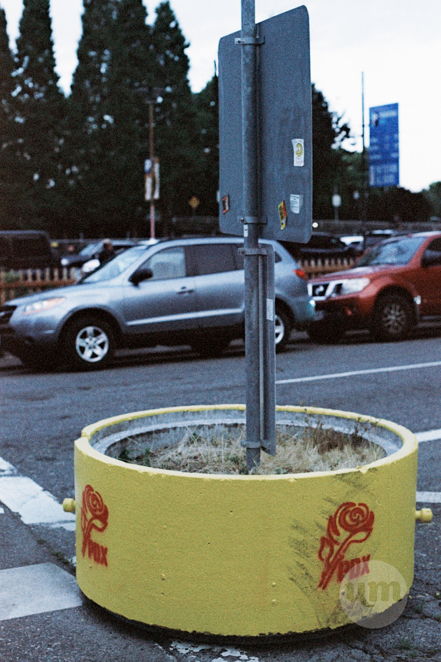 A candid street photograph captures a simple urban scene in downtown Portland, Oregon. In the foreground, a yellow concrete planter with a red rose and "pdx" logo sits at the curb. Behind it, a traffic sign is visible, with cars parked along the street. The image has a quiet, everyday feel, focusing on the small, authentic details of a city street.