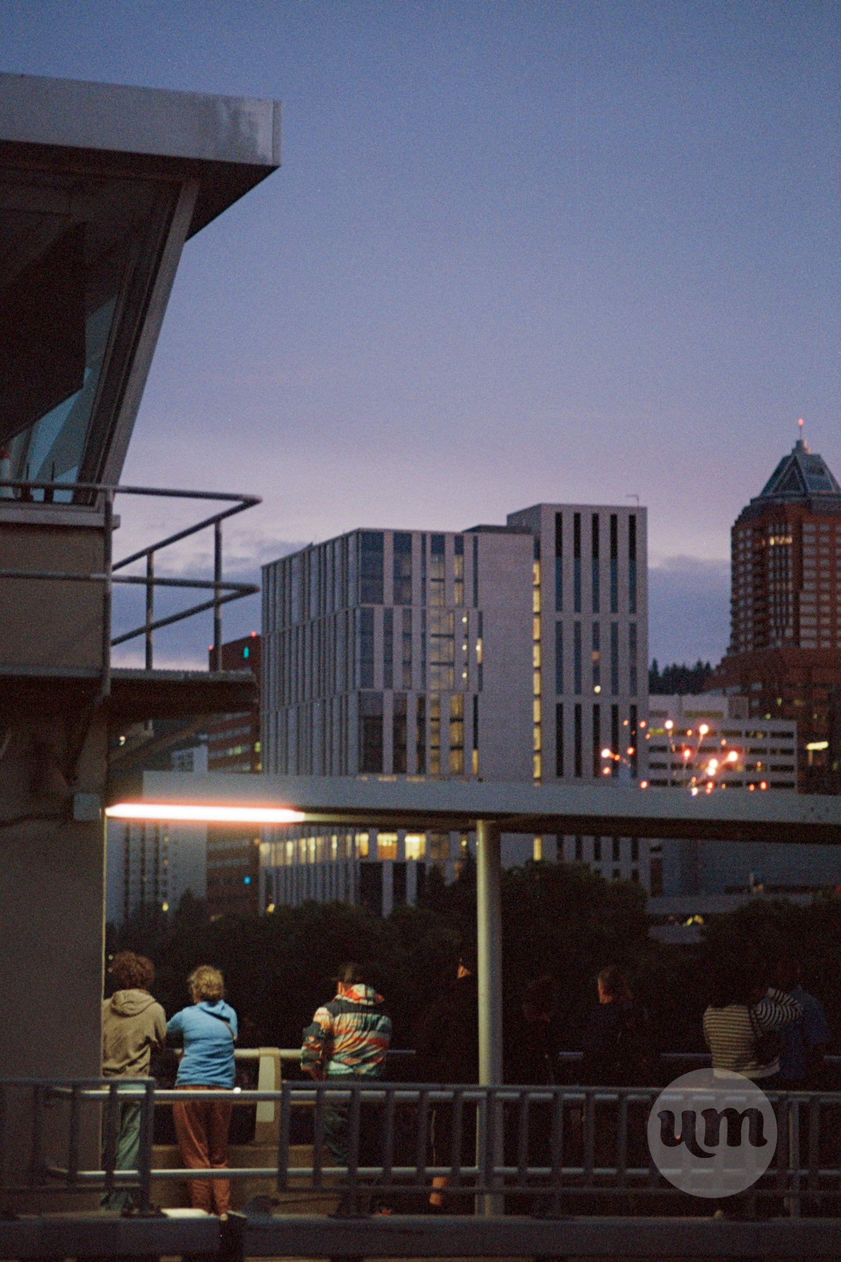 A candid street photograph captures a serene, urban scene in downtown Portland, Oregon at dusk. A group of people stands on a bridge railing, looking out at the city skyline. The glowing lights of the buildings and the soft light of twilight create a peaceful and contemplative atmosphere, highlighting the tranquil beauty of the urban landscape.