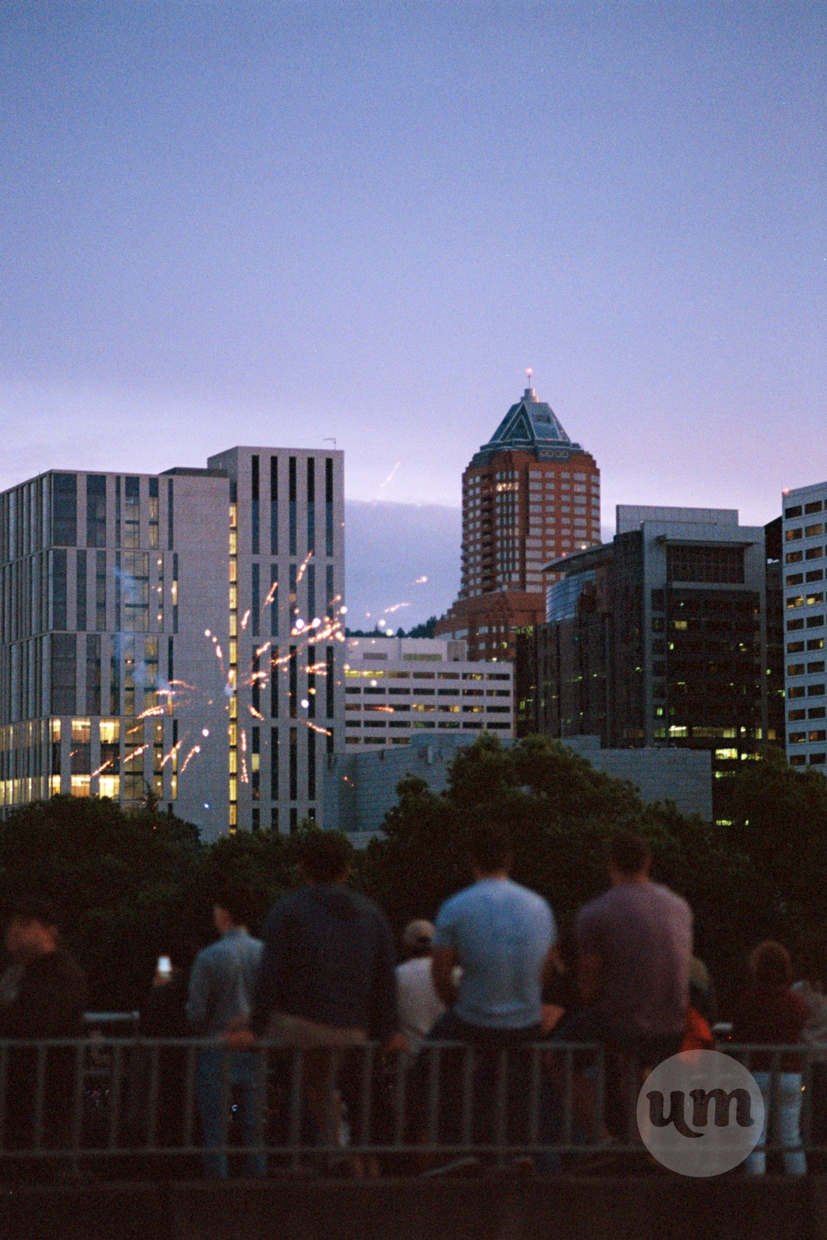 A candid photograph captures a group of people sitting on a bridge railing, watching fireworks over the Portland, Oregon skyline at dusk. The glowing light trails from a firework are visible against the city's buildings, adding a sense of celebration to the serene urban scene. The image highlights a communal and peaceful moment of shared experience.