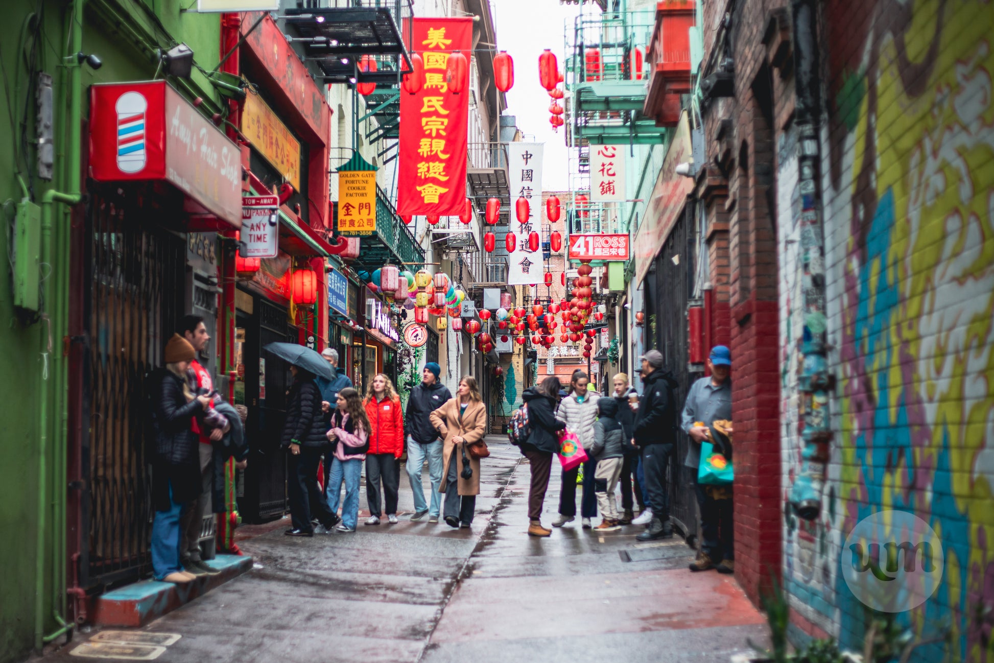 A vibrant daytime street scene in Ross Alley within San Francisco's Chinatown on New Year's Eve. The narrow historic alleyway is decorated with rows of hanging red lanterns and traditional Chinese banners, including signage for the famous Golden Gate Fortune Cookie Factory. Pedestrians and tourists in winter clothing walk along the damp pavement past colorful storefronts and brick buildings, capturing the dense, cultural atmosphere of this iconic California landmark.