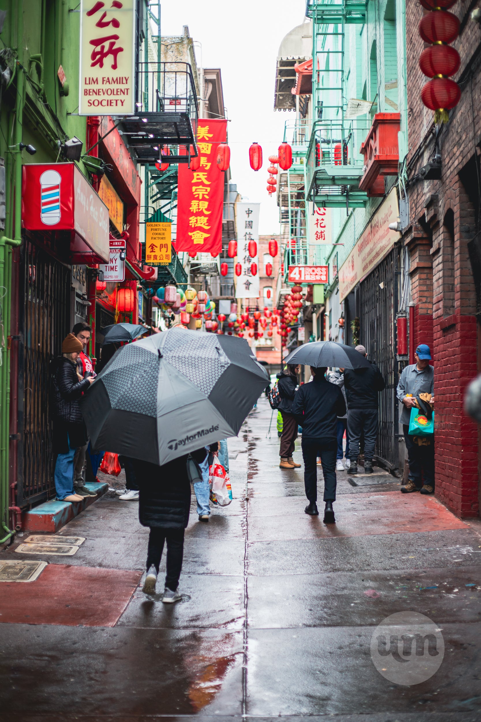 A rainy afternoon in Ross Alley during New Year's Eve in San Francisco's Chinatown. The historic narrow street is filled with pedestrians, some using umbrellas to navigate the damp pavement beneath rows of vibrant red lanterns and festive Chinese banners. This candid street scene highlights the architectural charm of the brick buildings and colorful storefronts, including the Lim Family Benevolent Society, capturing the enduring cultural energy of this iconic California neighborhood.