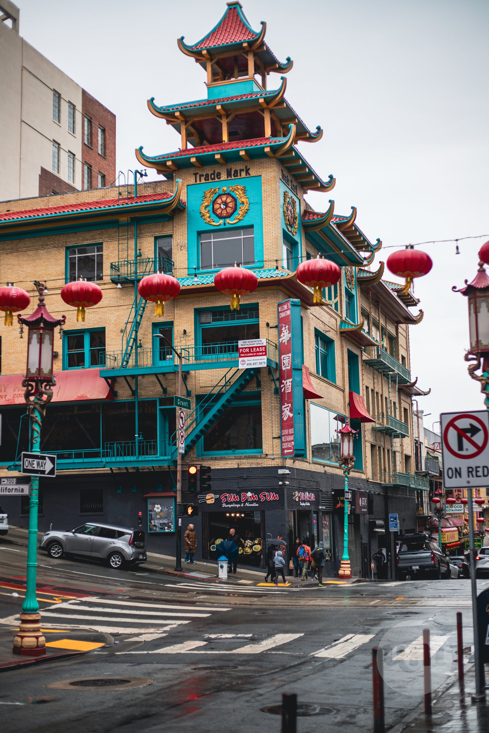 A striking architectural shot of the iconic Trade Mark building at the corner of Grant Avenue in San Francisco's Chinatown. The historic yellow brick structure features a distinct multi-tiered pagoda roof with vibrant turquoise trim and gold ornate detailing, including a traditional bagua symbol. The street-level view captures the steep incline of the hill, wet from a rainy New Year's Eve, with local businesses like Sum Dim Sum occupying the ground floor beneath rows of festive red lanterns.