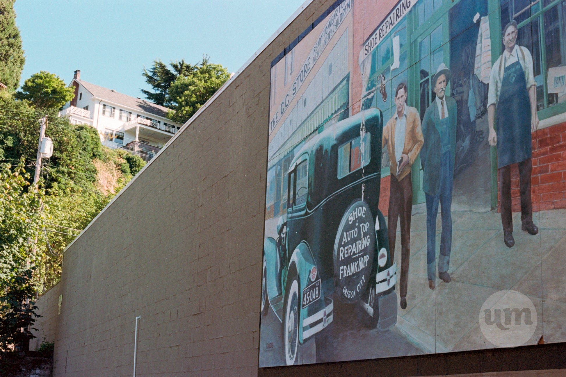 A large, colorful, historic mural depicting an old-fashioned street scene with people and a vintage car is painted on the side of a building in Oregon City, Oregon. The building's wall stretches up a hillside, where a multi-story home is visible in the background. The mural captures the city's past, while the modern home on the hill represents its present, highlighting the blend of history and contemporary life.
