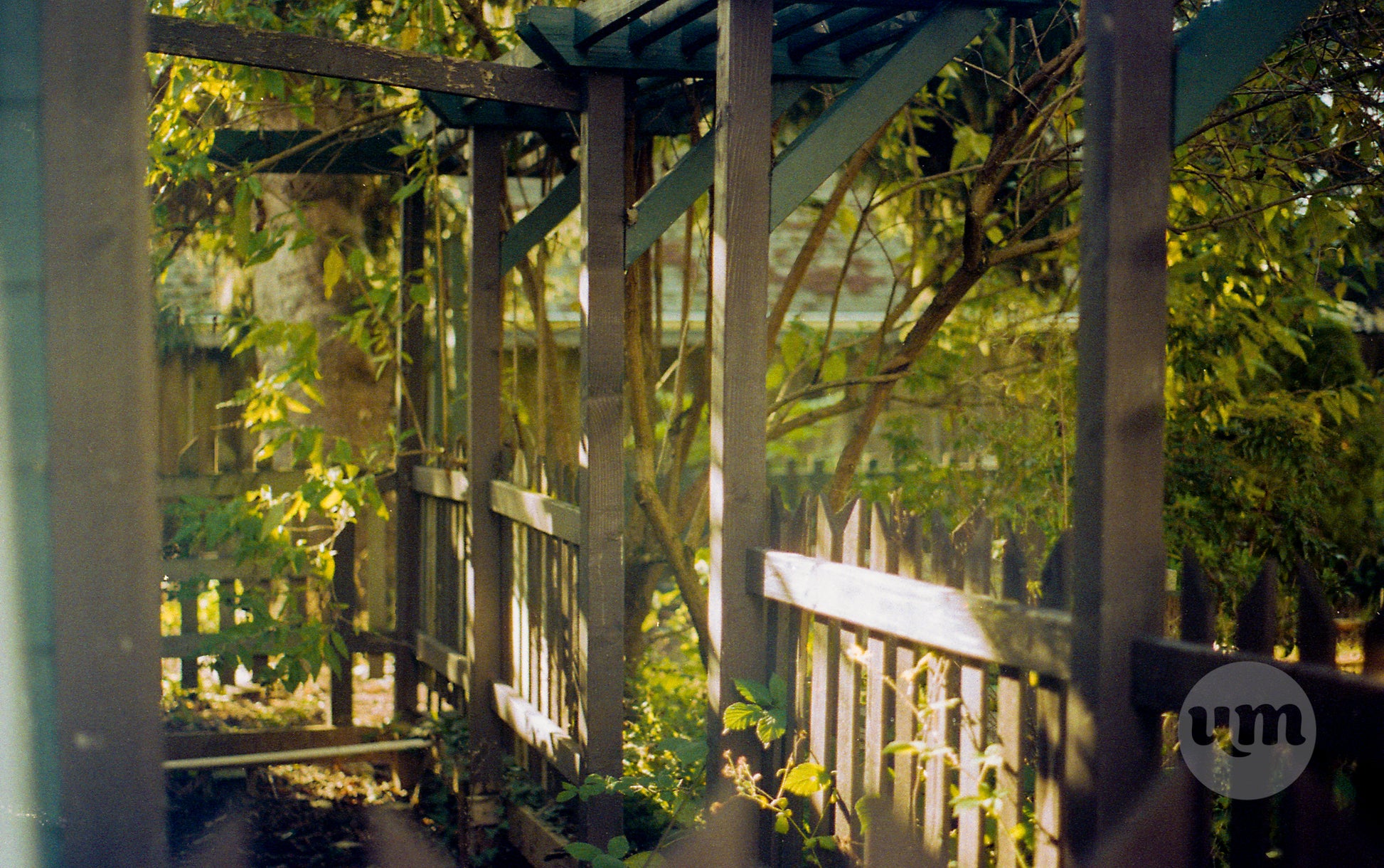 A serene and sun-drenched photograph of a wooden pergola and picket fence in a Portland, Oregon backyard garden during golden hour. The slanting sunlight casts long shadows and illuminates the rustic wood, creating a peaceful and warm atmosphere. The image captures a quiet, "slice of life" moment, evoking a sense of tranquility and the natural beauty of a home garden.
