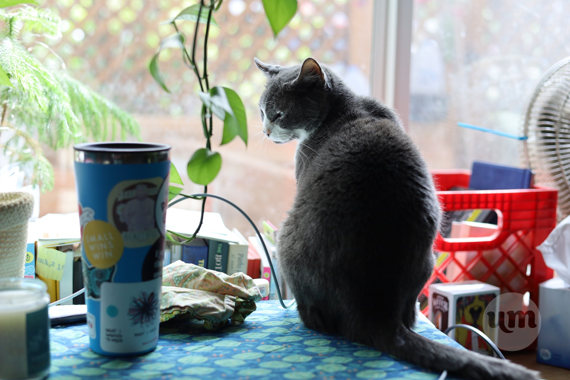 A candid and authentic photograph of a gray and white cat sitting on a cluttered surface, with its back to the camera, looking out a window. The scene captures a quiet, everyday moment in a home, with a sense of peaceful contemplation. The various items on the table and the plants in the background add to the "slice of life" feel of the image.