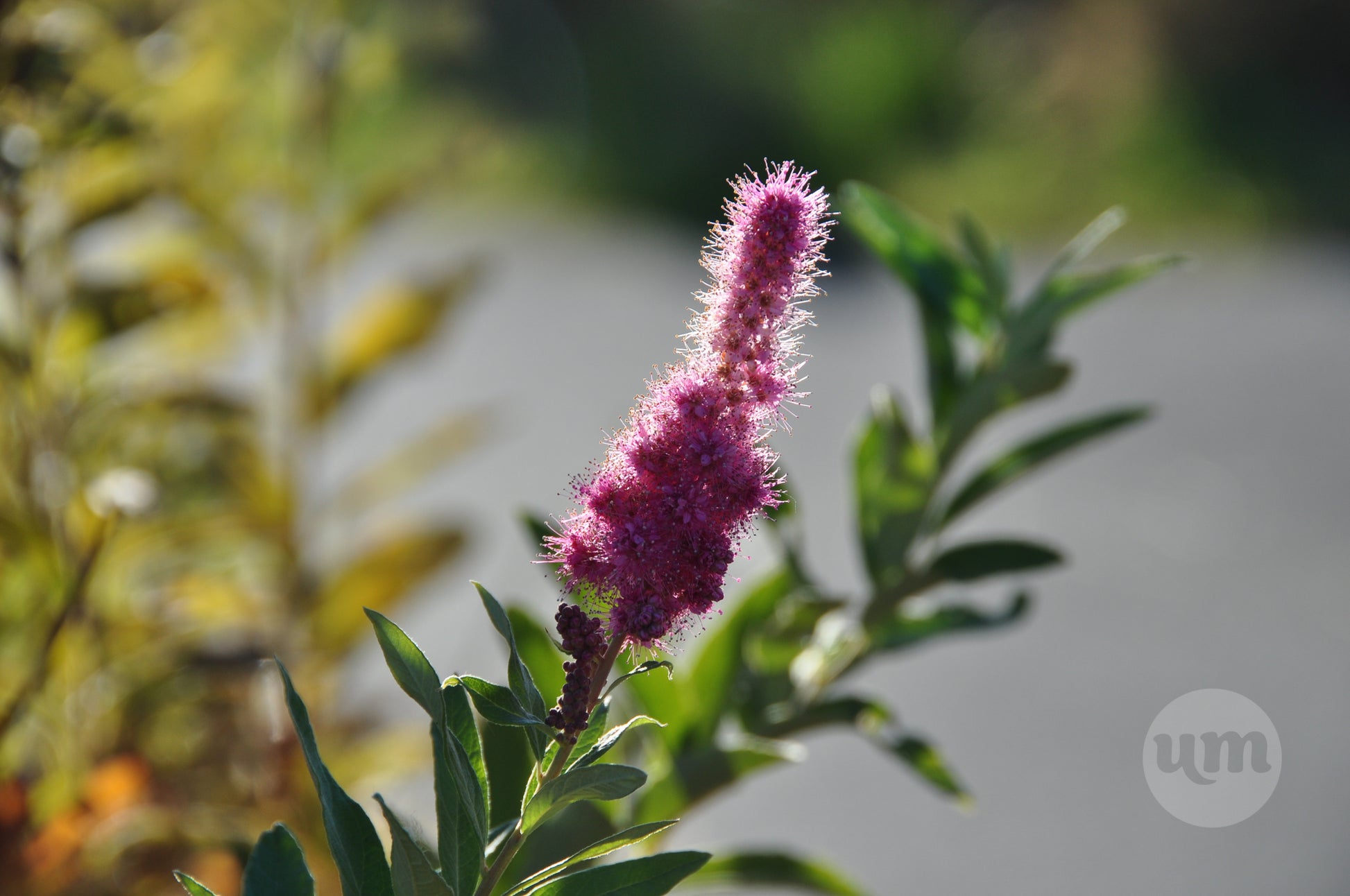 A beautiful close-up photograph of a vibrant pink or purple spirea flower. The sunlight creates a soft, luminous glow around the flower's delicate, feathery petals. The shallow depth of field creates a soft, blurred background that draws the eye to the flower's intricate details, capturing a peaceful and beautiful moment of nature.