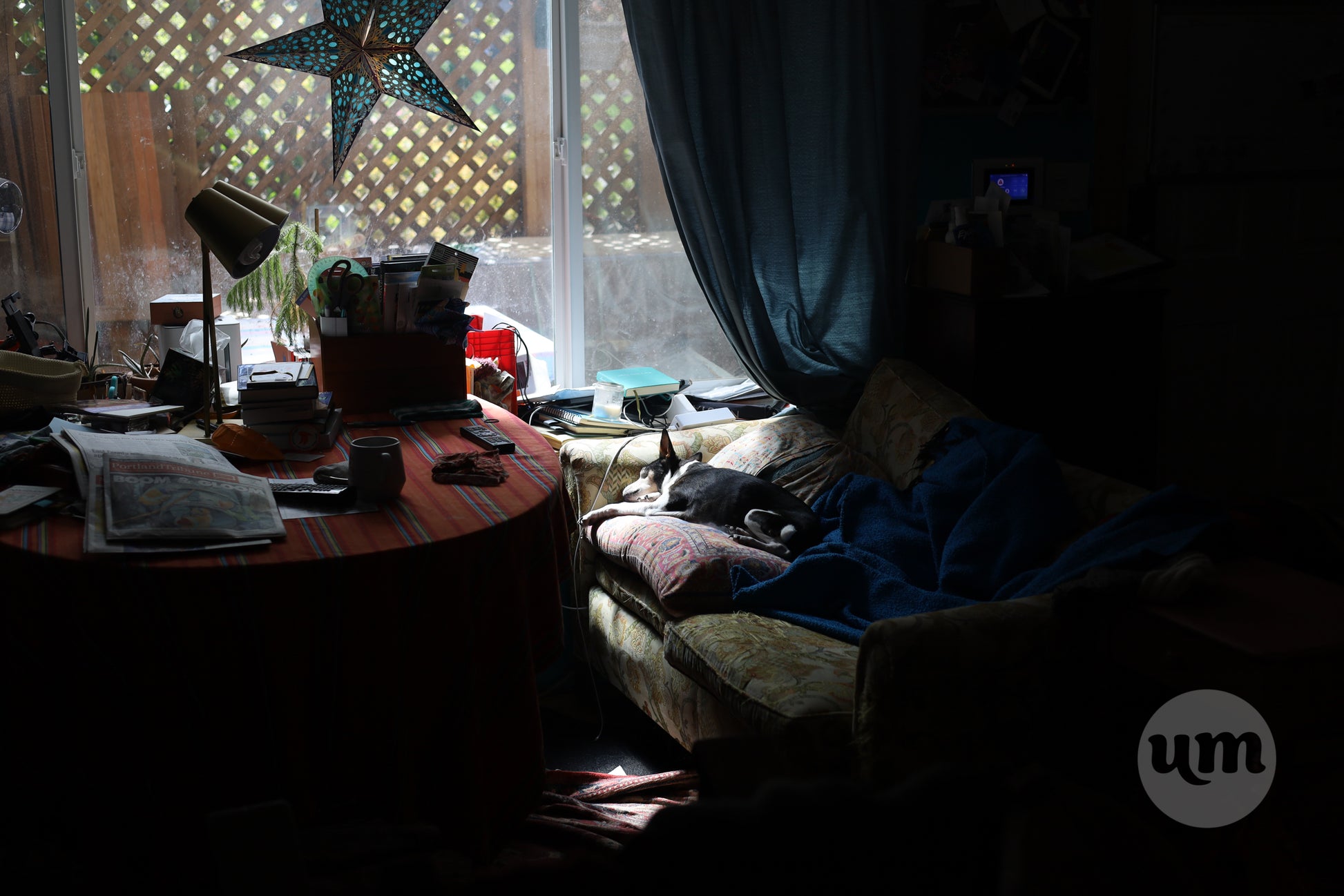 A cozy and intimate photograph of a dog sleeping in a sunbeam on a couch in a home. The scene is filled with a sense of peaceful quiet, with light and shadow creating a dramatic and serene atmosphere. The cluttered tabletop and a large star decoration add to the authentic, lived-in "slice of life" feel of the image.