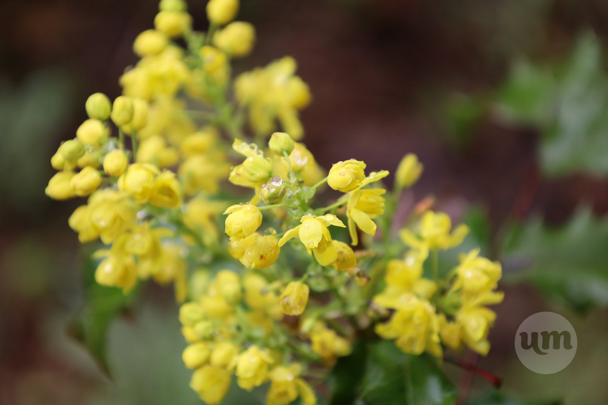A beautiful close-up photograph of vibrant yellow flowers from the Oregon Grape plant, with one perfect water droplet glistening in the center. The image captures the fresh, tranquil beauty of a rainy day, highlighting the delicate petals and the intricate details of the plant's texture against a soft, blurred background.