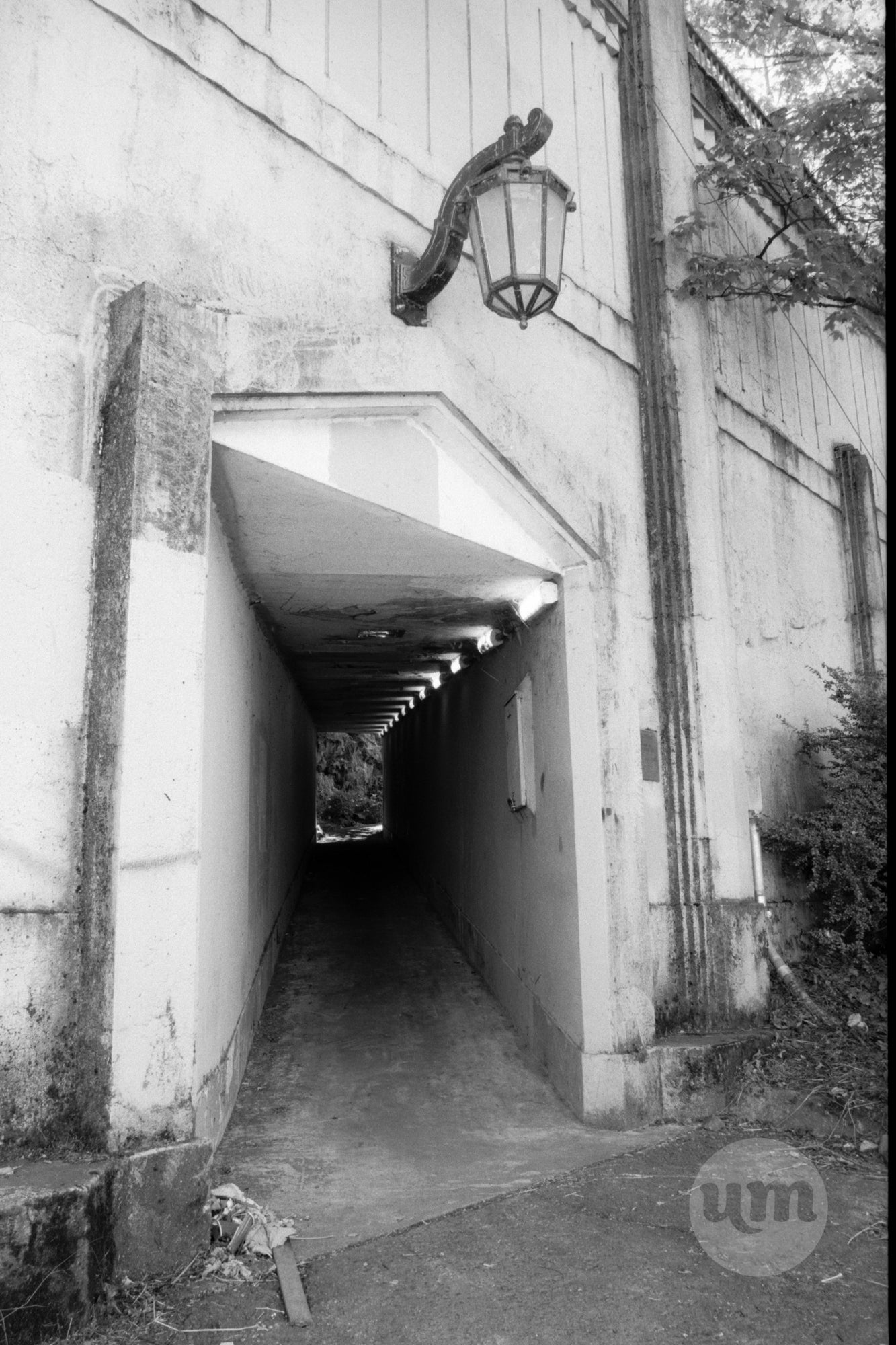 A long, narrow pedestrian tunnel is captured in a stark black and white photo in Oregon City, Oregon. A vintage lantern is mounted on the wall above the entrance, contrasting with the dark, uninviting path that recedes into the distance. This photo highlights a moody, unpolished aspect of the city's urban environment.
