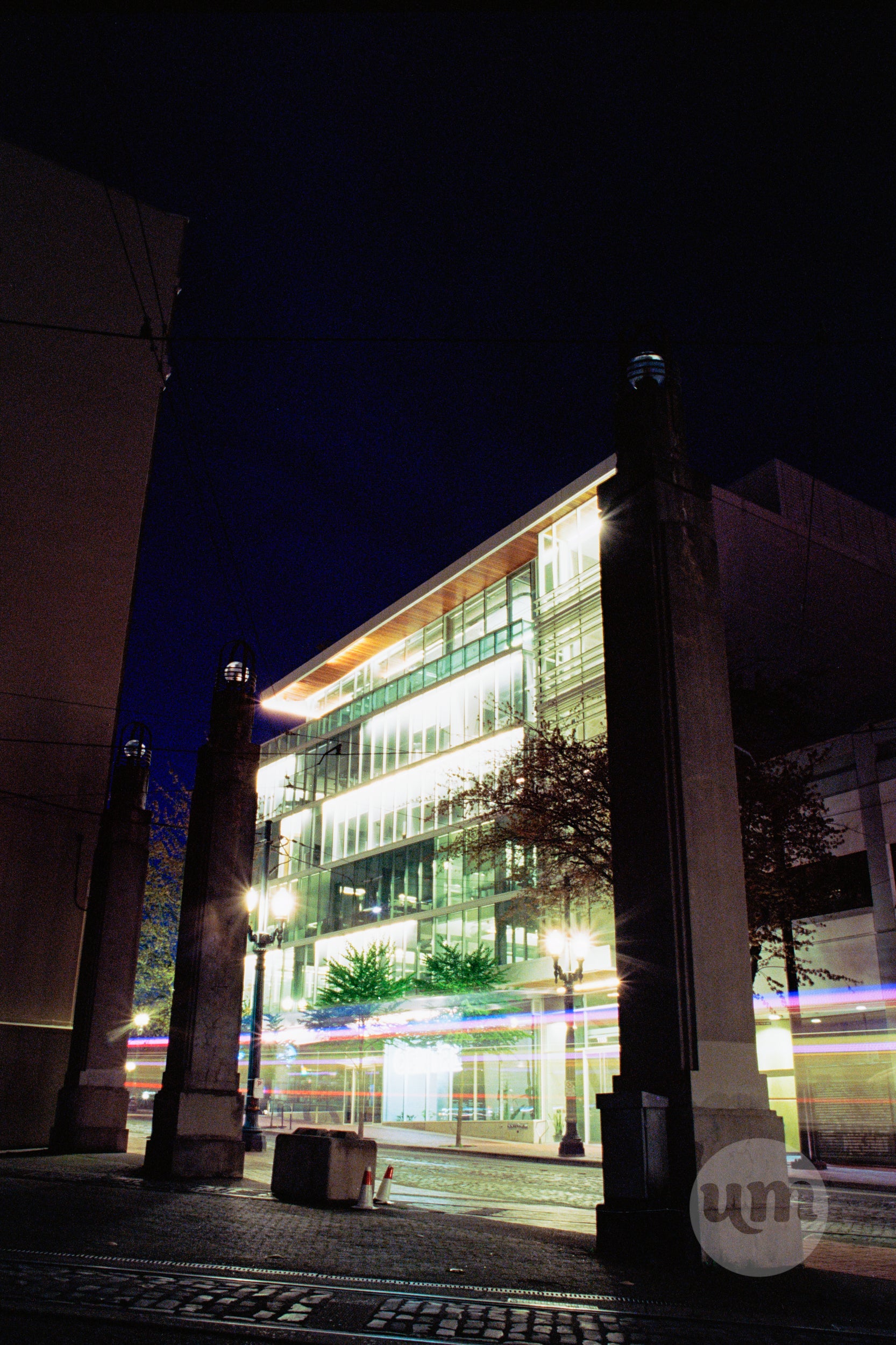 A stunning long-exposure photograph of a modern glass building in downtown Portland, Oregon at night. The building glows with warm light, and bright light trails from passing traffic streak across the foreground, creating a dynamic contrast between the stationary architecture and the city's motion. The unique composition, with concrete pillars framing the scene, adds a sense of urban grandeur.