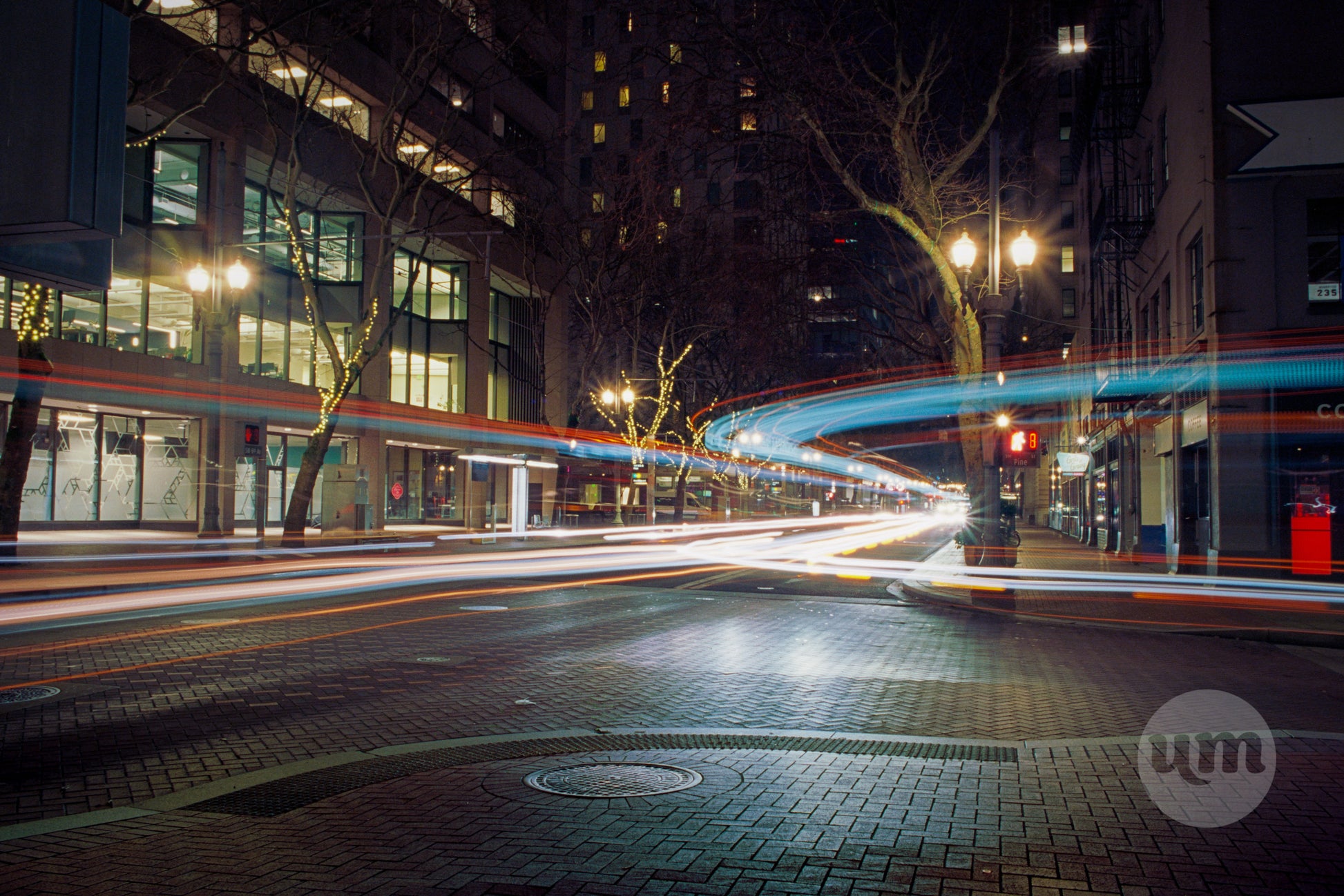 A dynamic long-exposure photo of a curving street in downtown Portland, Oregon at night. Streaks of red and blue light trails from a turning vehicle dominate the right side of the frame, creating a sense of powerful motion. The wet cobblestone street reflects the bright urban lights, while the illuminated storefronts and streetlights add to the vibrant, energetic atmosphere.