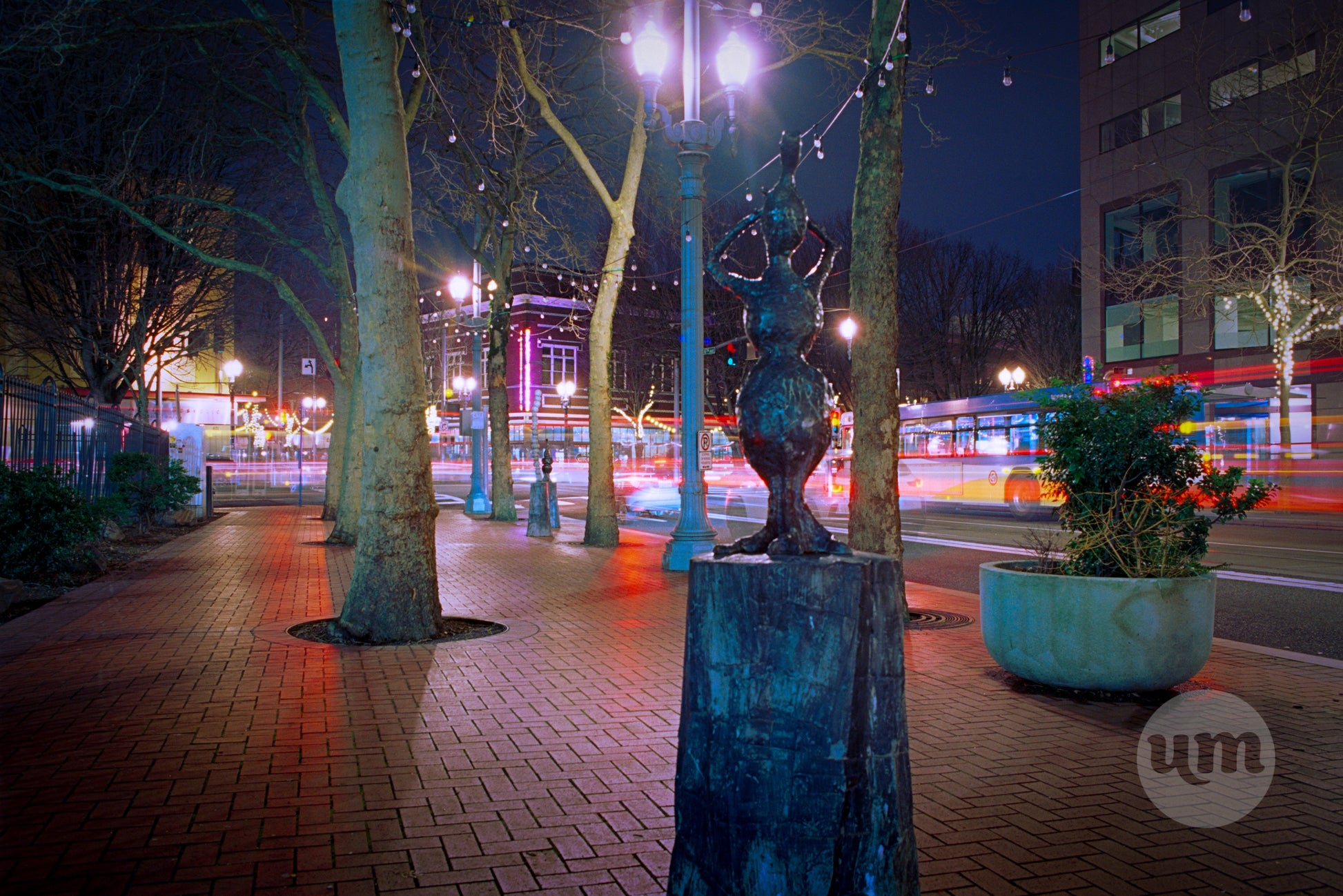 A beautiful long-exposure photograph of a public sculpture on a brick sidewalk in downtown Portland, Oregon. The statue stands in sharp focus, while behind it, a bus or other vehicle blurs by, leaving vibrant red and white light trails that highlight the bustling city street. The scene is illuminated by the warm glow of classic streetlights, creating a captivating contrast between the static art and the city's dynamic motion.