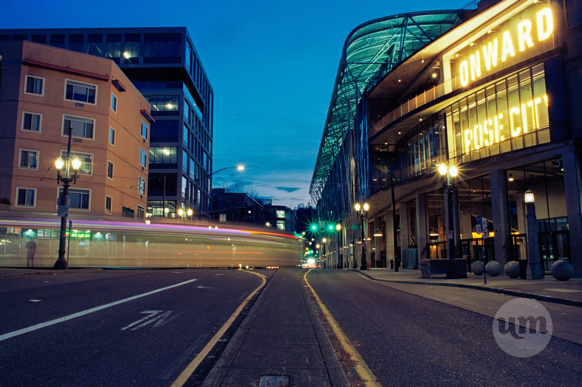 A captivating long-exposure photo of a streetcar creating a soft light trail as it moves through downtown Portland, Oregon. The scene is dominated by a modern building with a glowing "ONWARD ROSE CITY" sign. The street is nearly empty, with the warm glow of streetlights and the cool blue sky creating a serene, yet dynamic, urban landscape.