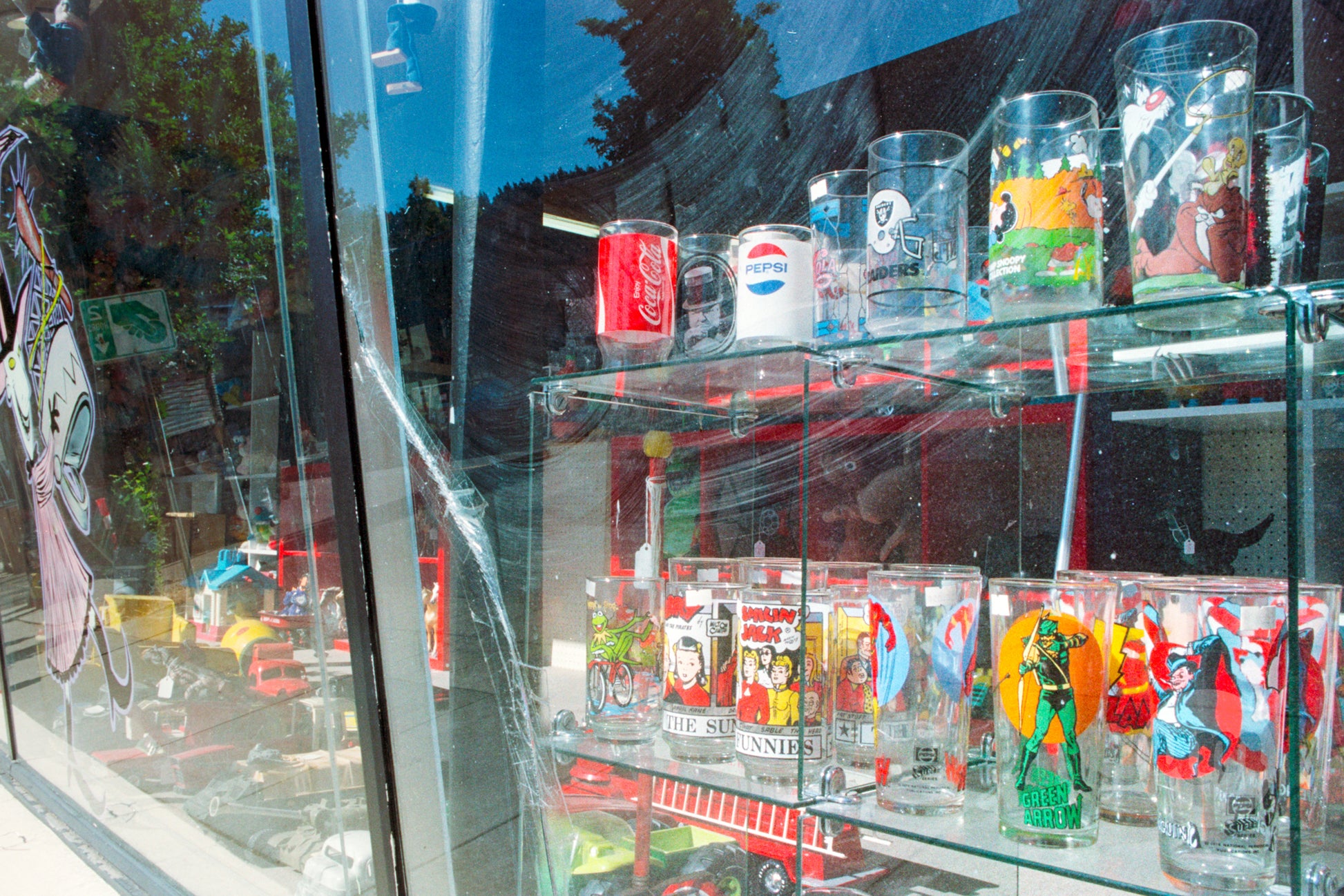 A vibrant collection of vintage cartoon and branded drinking glasses is displayed in a sunny storefront window in downtown Oregon City, Oregon. The glass shelves hold a variety of collectible glassware, from Pepsi and Looney Tunes to Star Wars and McDonald's characters. The photo captures a nostalgic and whimsical slice of a local antique or collectible shop.