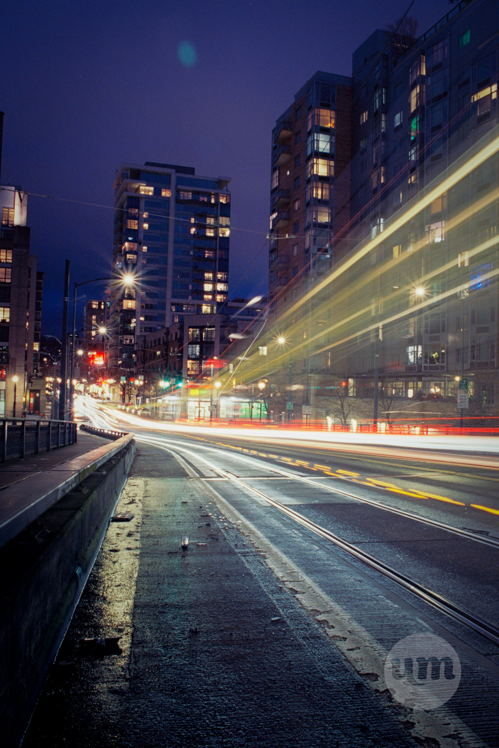 A long-exposure photograph captures the lively energy of a downtown Portland street at night. Bright white and red light trails from passing traffic streak along the streetcar tracks, leading the eye toward the glowing windows of the modern apartment buildings that line the road. The cool tones of the twilight sky and the wet pavement add a serene atmosphere to the dynamic urban scene.
