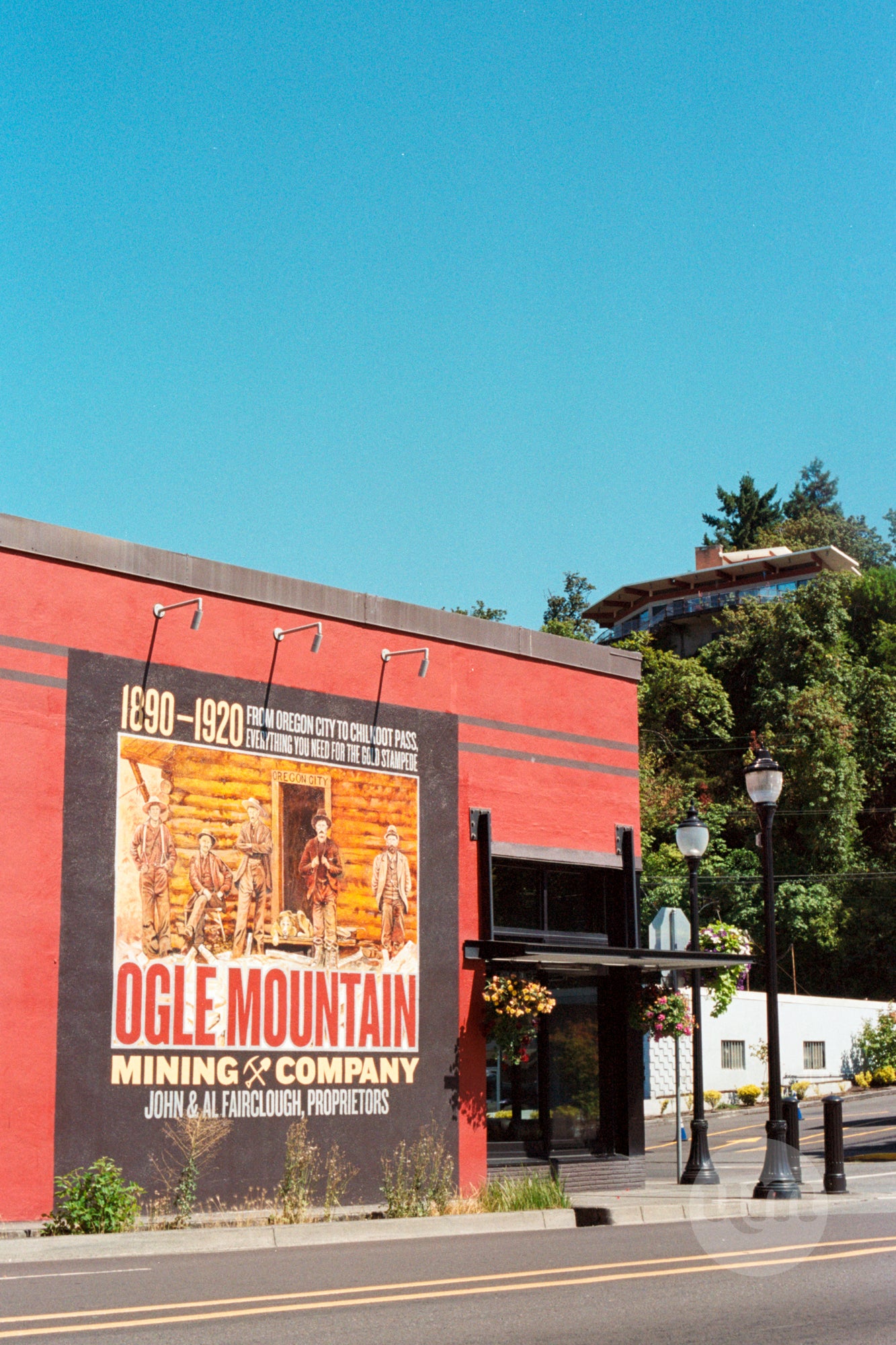 A red brick building in Oregon City, Oregon, features a large, historic mural advertising the Ogle Mountain Mining Company. The building stands against a clear, bright blue sky, with a modern-style home nestled in the green, tree-covered hillside in the background. The image showcases the city's blend of history, unique architecture, and natural landscape.