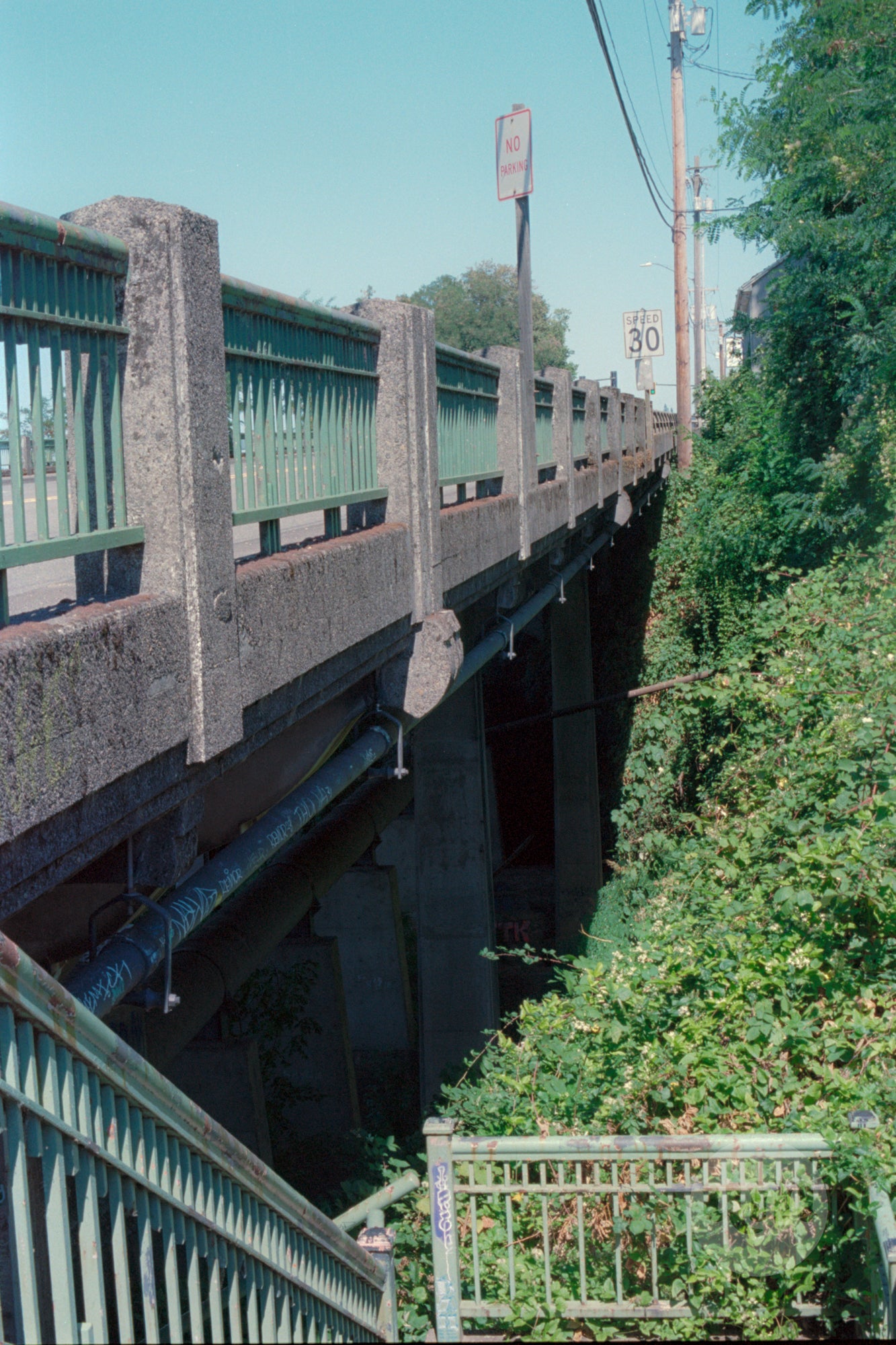 A low-angle view captures a concrete overpass with green metal railings in Oregon City, Oregon. The infrastructure is surrounded by overgrown greenery and a "NO PARKING" sign is visible above. The image highlights a unique, and somewhat gritty, side of the city's urban environment.