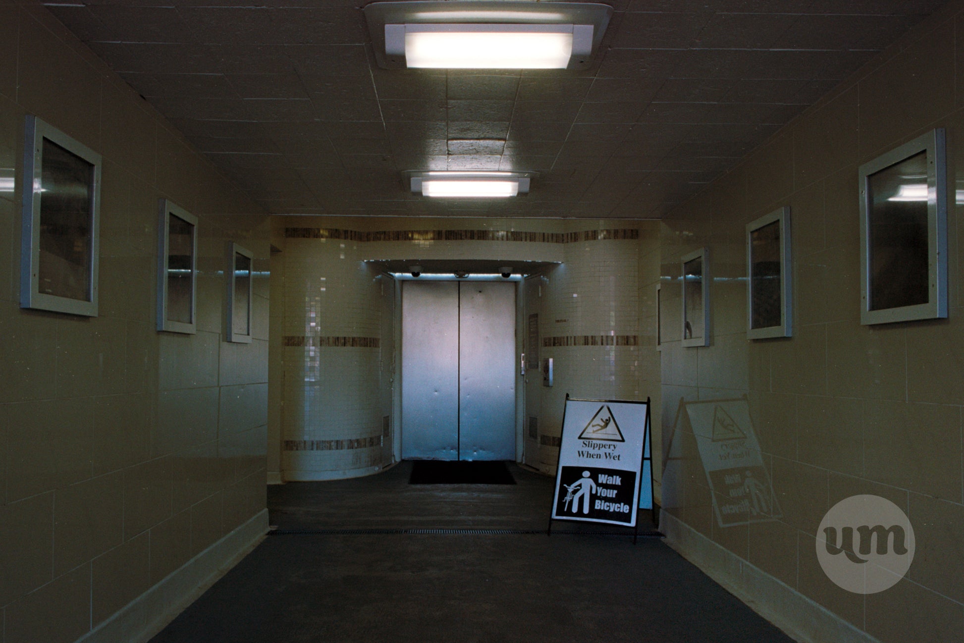 The brightly-lit interior of the Oregon City Municipal Elevator's lower tunnel is captured from a long, receding perspective. The walls are lined with off-white tiles, and framed photos add a touch of art to the space. A "Slippery When Wet" sign stands in the foreground, with the elevator doors visible at the end of the corridor. The photo captures a quiet, nostalgic view of the city's unique public infrastructure.