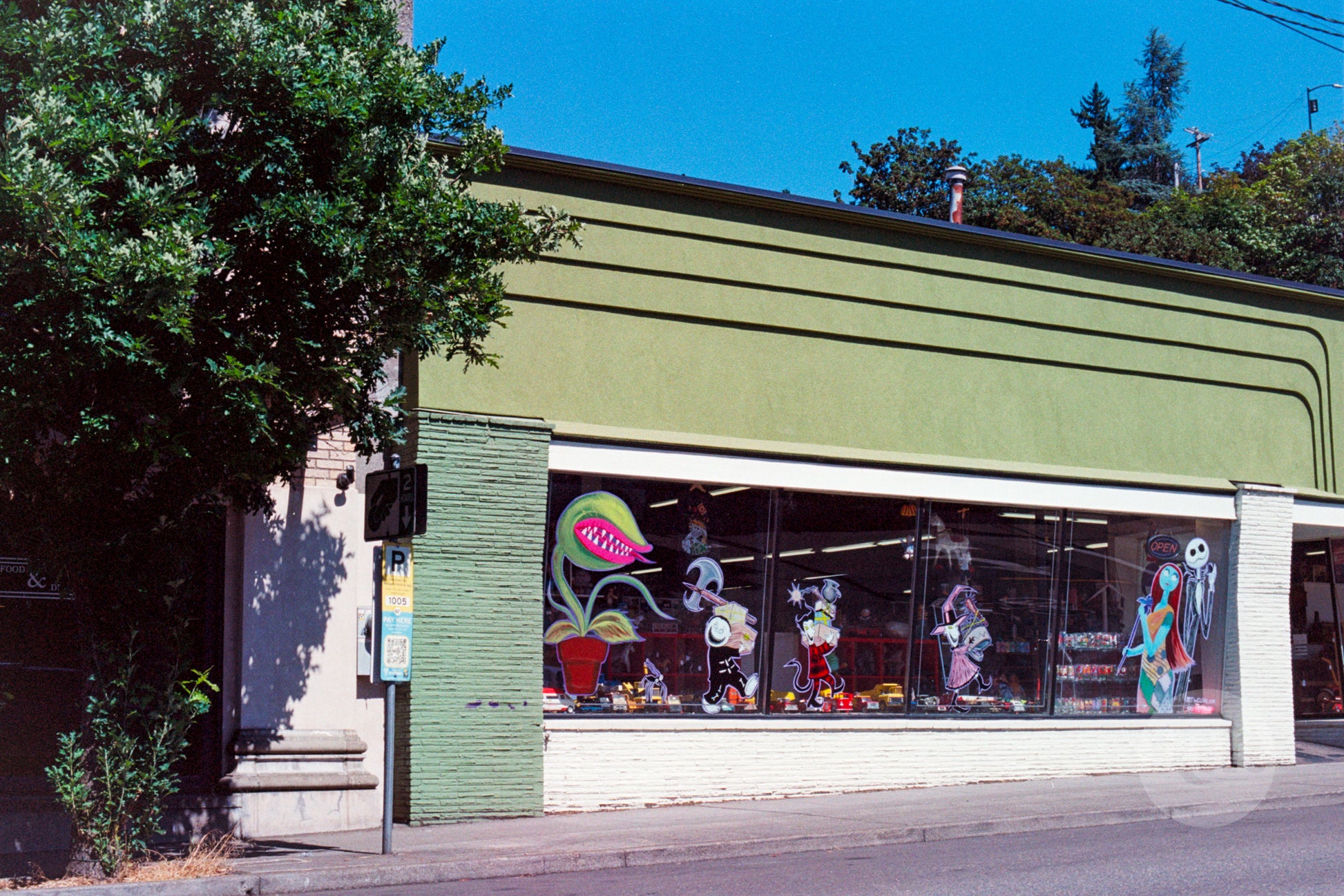 A vibrant storefront with large display windows is visible on a sunny street in Oregon City, Oregon. The windows feature colorful, hand-painted artwork of characters from The Nightmare Before Christmas, while a green awning stretches across the top. The scene captures the unique and eclectic small-town charm of the area.