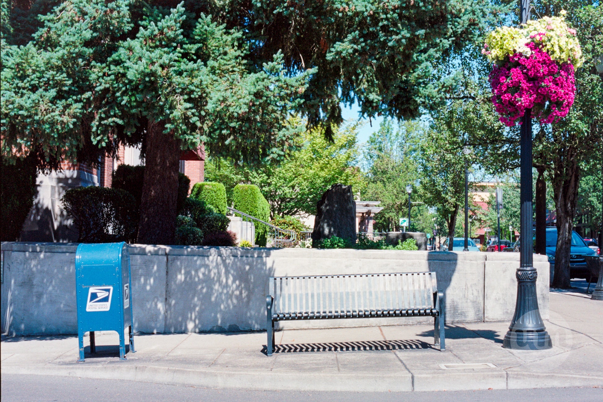 A blue U.S. Postal Service mailbox and an empty park bench sit on a sun-drenched sidewalk in downtown Oregon City, Oregon. A flowering hanging basket with vibrant pink and white blooms adorns a nearby lamppost, while a large evergreen tree provides shade. The scene captures the peaceful, classic feel of a small American town on a quiet summer day.
