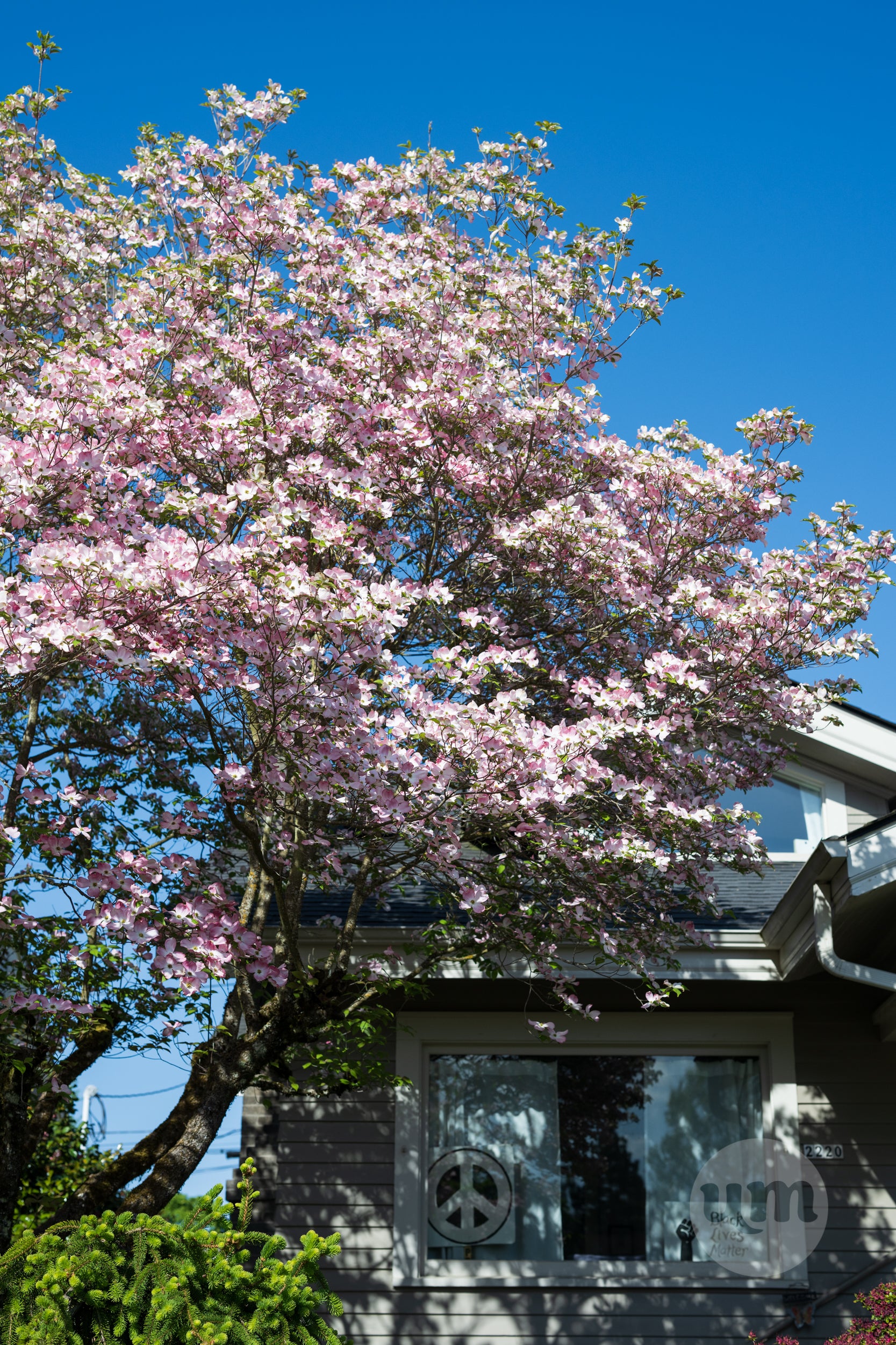 A stunning dogwood tree with a canopy of pink blossoms stands in front of a residential home in a Portland, Oregon neighborhood. A peace sign and "Black Lives Matter" signs are visible in the window of the house, adding a layer of social context to the beautiful, blooming urban scene.