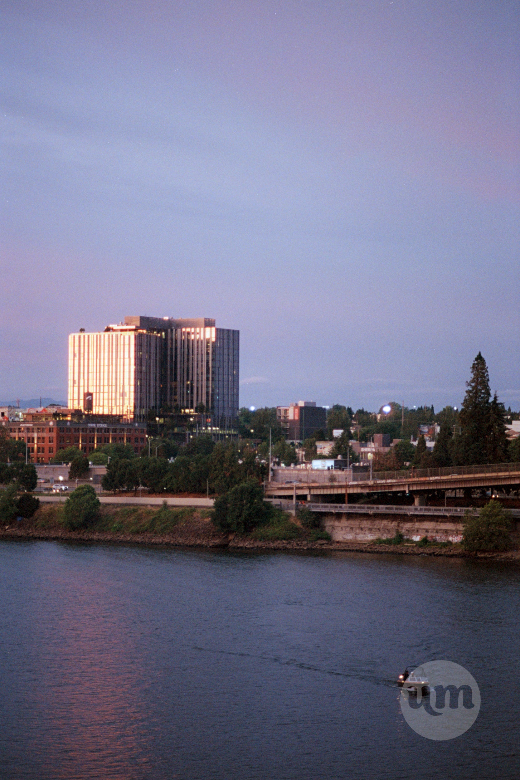 A beautiful photograph capturing a serene moment of the Willamette River and the Portland, Oregon cityscape at dusk. The water reflects the soft colors of the twilight sky and the glow of the buildings on the shoreline. A lone boat is visible on the river, adding a sense of peaceful human activity to the tranquil urban landscape.