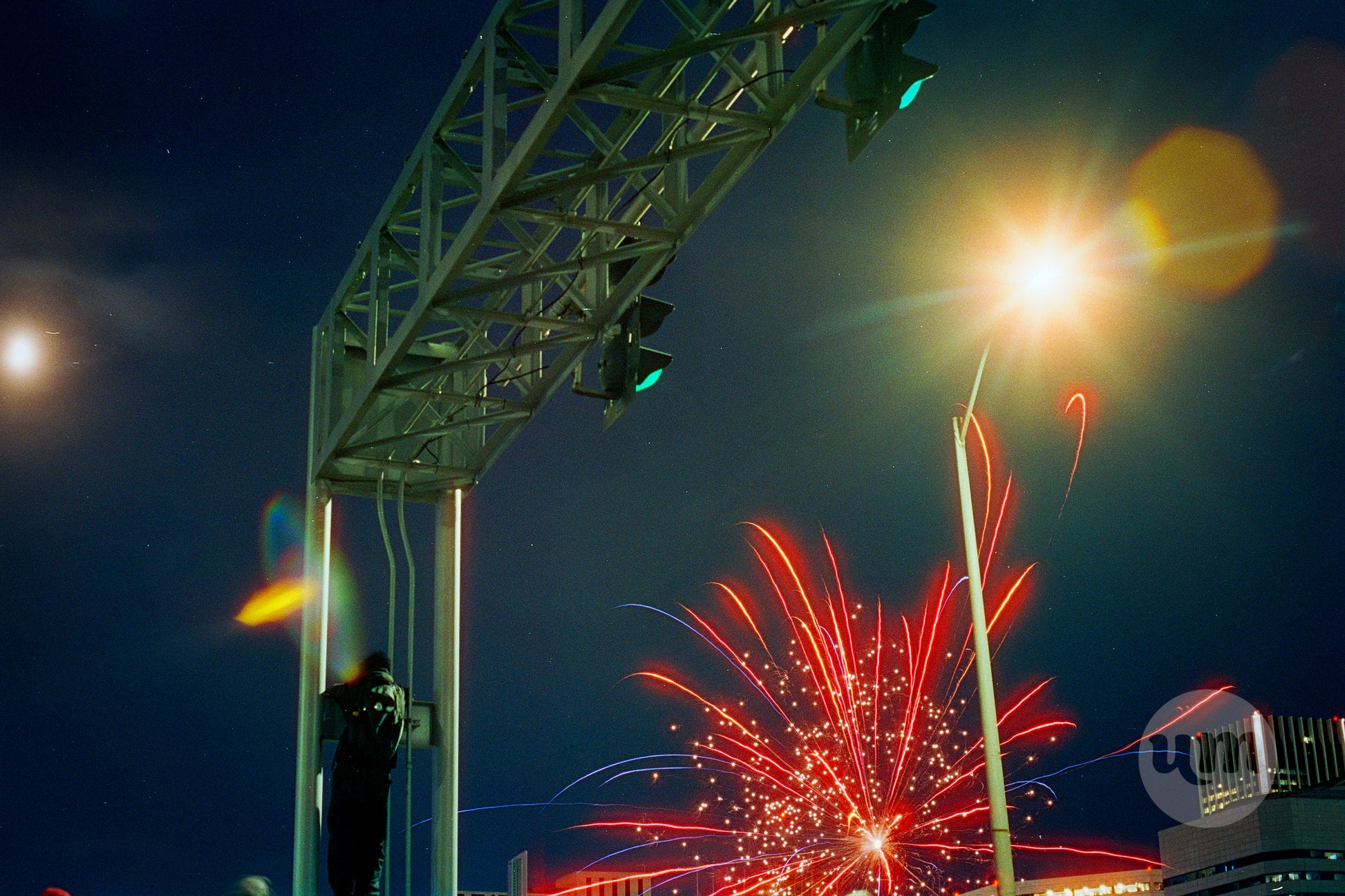 A brilliant photograph captures a fiery red firework explosion illuminating the night sky over downtown Portland, Oregon. The image is a study in urban geometry and light, with a lamppost creating a bright starburst and the intricate metalwork of a bridge sign visible above. A person stands silhouetted against the bright lights, adding a human element to this lively urban celebration.